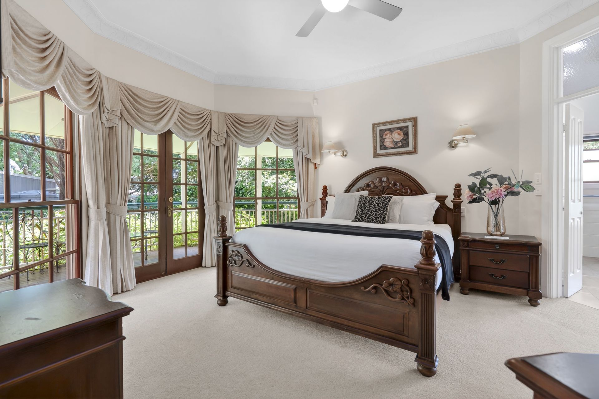 Beyond the residence, manicured lawns, botanical gardens and established fruit trees create a tranquil, private environment that enhances the estate's romantic appeal.