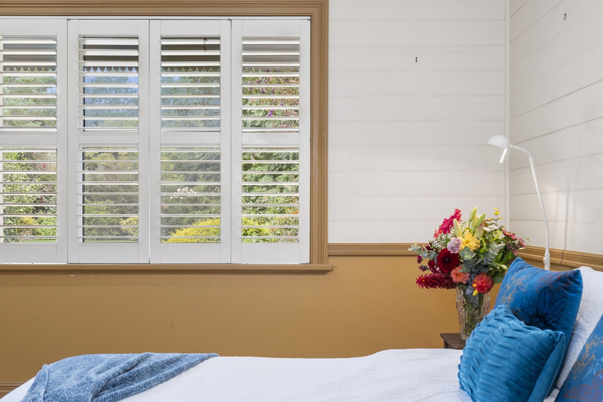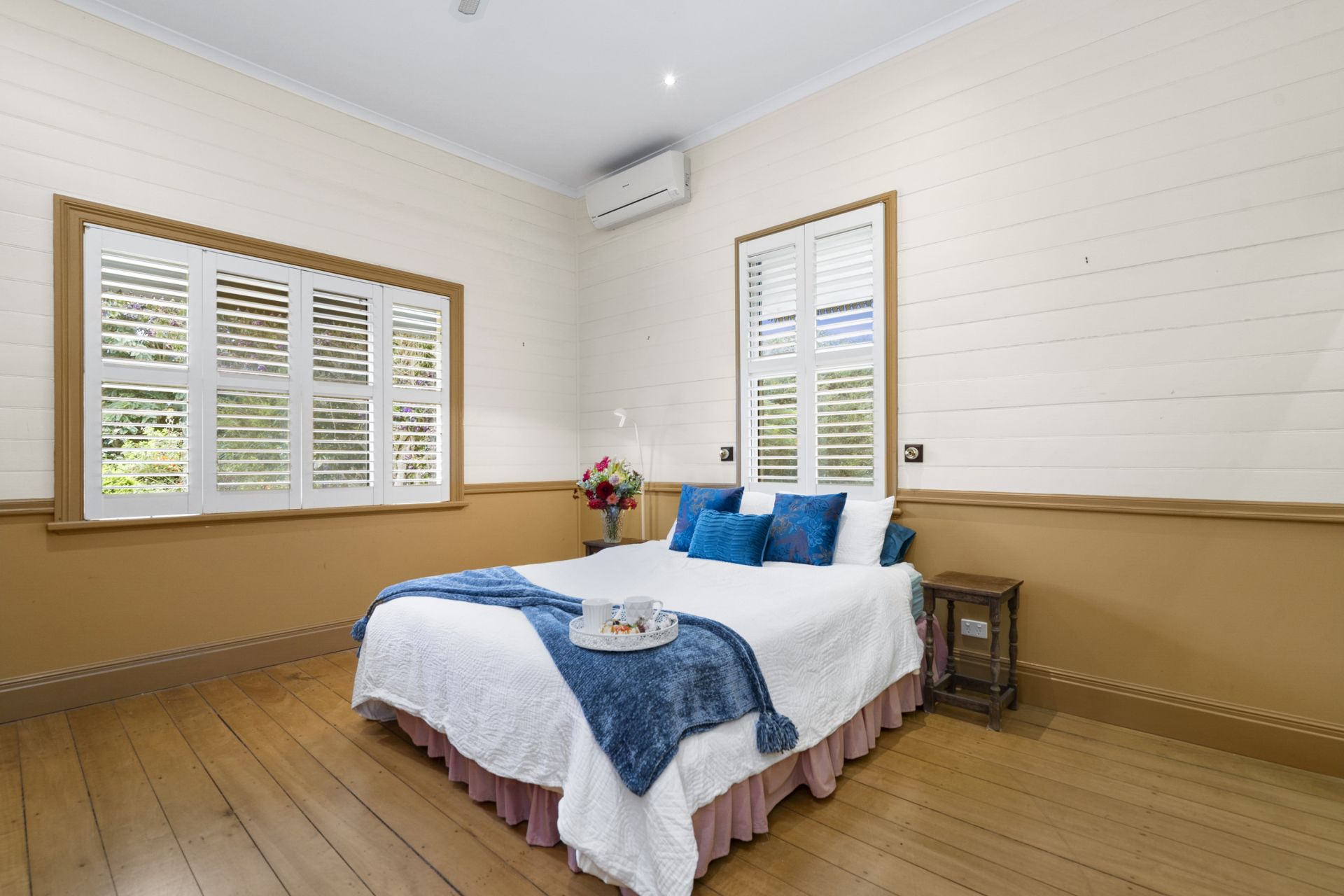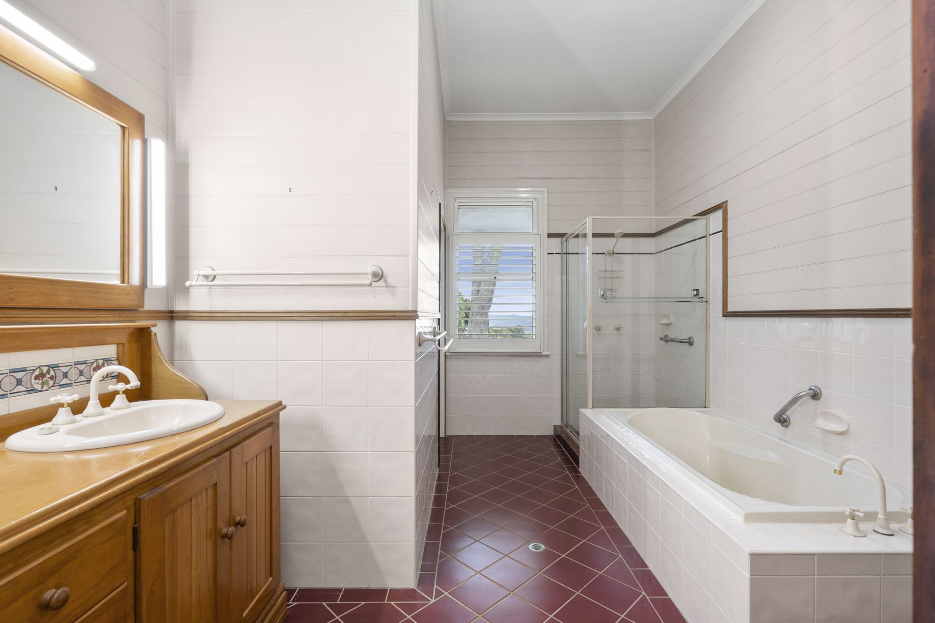 - Master bedroom is very spacious with a full wall of New Guinea Rosewood cupboards plus walk in robe, plantation shutters and very spacious ensuite which includes a bath, large shower, timber vanity with vintage tiles plus plantation shutters. This bathroom has dual access from the second living area and master bedroom