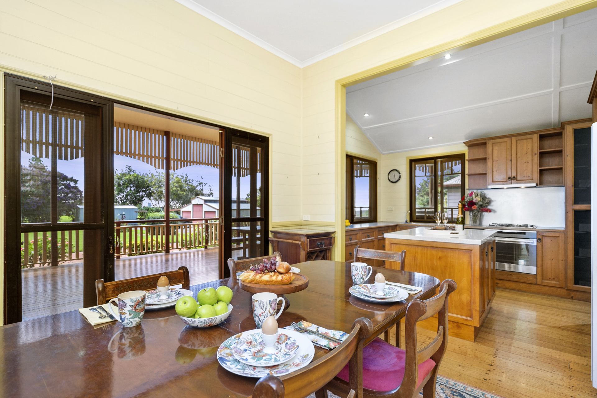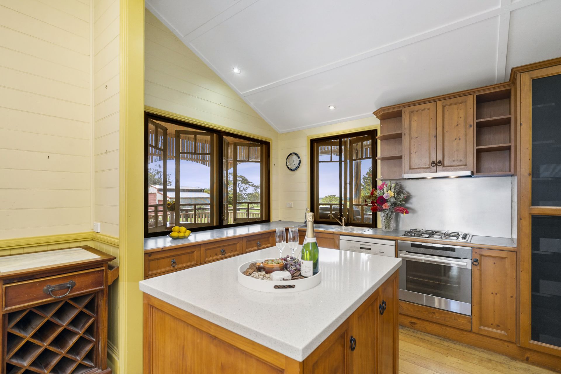 - Timber country kitchen overlooking the pretty front garden with gas cooktop, electric oven, stone island bench, Miele dishwasher, ample storage plus walk in pantry and access to the spacious laundry