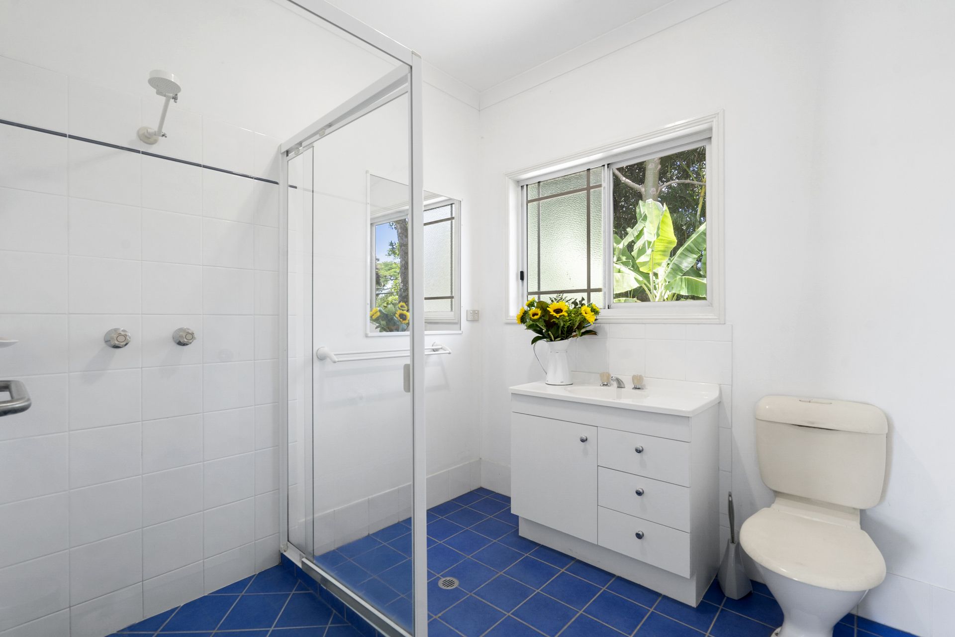 - Generous guest bathroom featuring vintage coloured glass windows, large shower with dual access from the library and guest bedroom