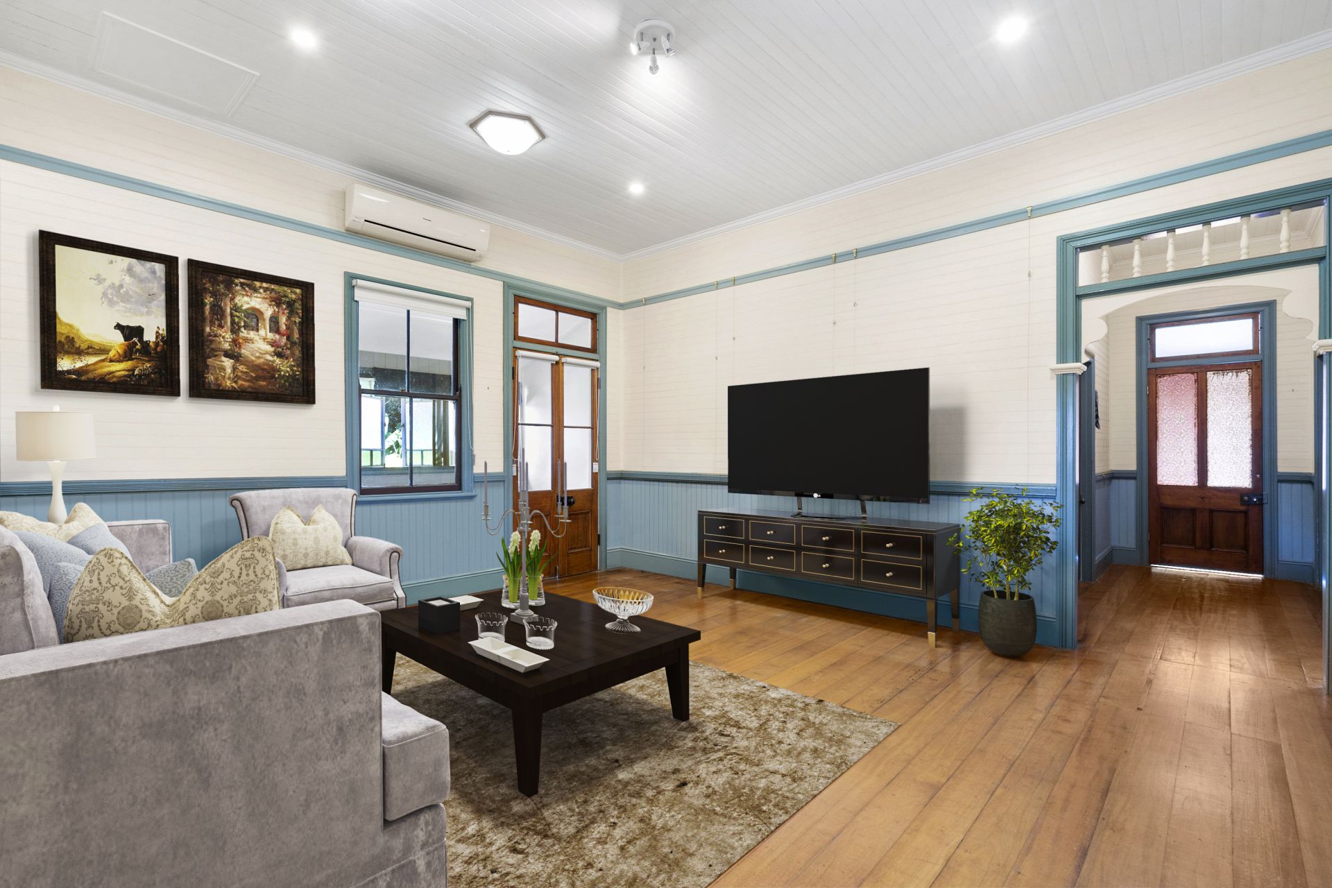 - Second large living room with split system air conditioning, opening to a library/sitting room featuring vintage glass windows