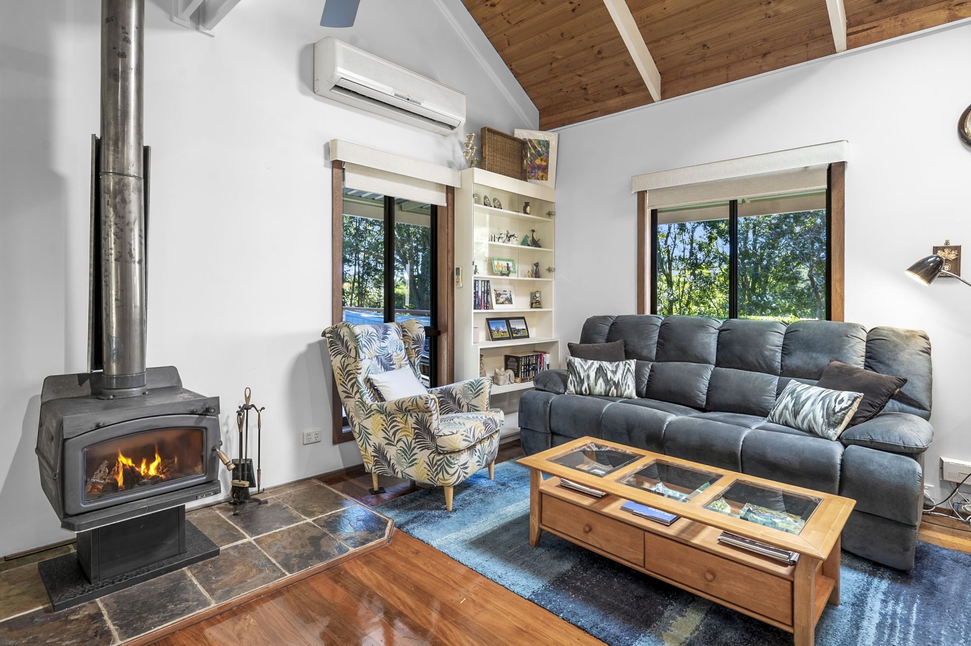 - The kitchen, dining and living areas feature vaulted timber ceilings with exposed rafters, split system reverse cycle air conditioning and gorgeous polished timber floors