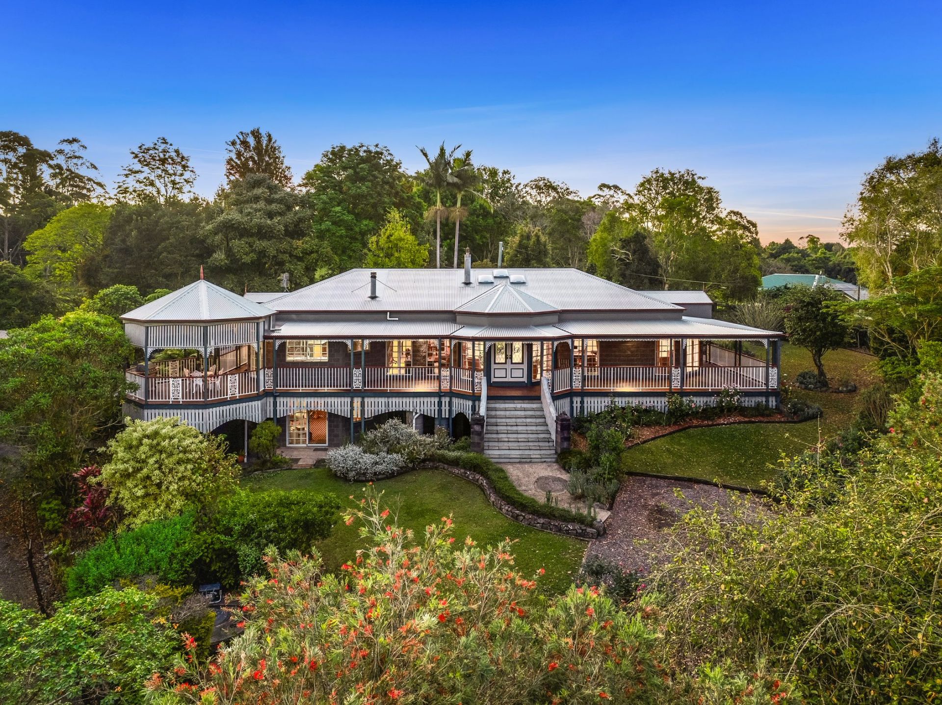 Beyond a grand entrance lies a truly majestic home that combines Queenslander charm with enduring craftsmanship. Elevated and encircled by wide verandahs, it features an inviting rotunda off the kitchen and a solid brick build that ensures lasting quality. This beautifully presented home is a statement of style and grace in a tranquil setting.