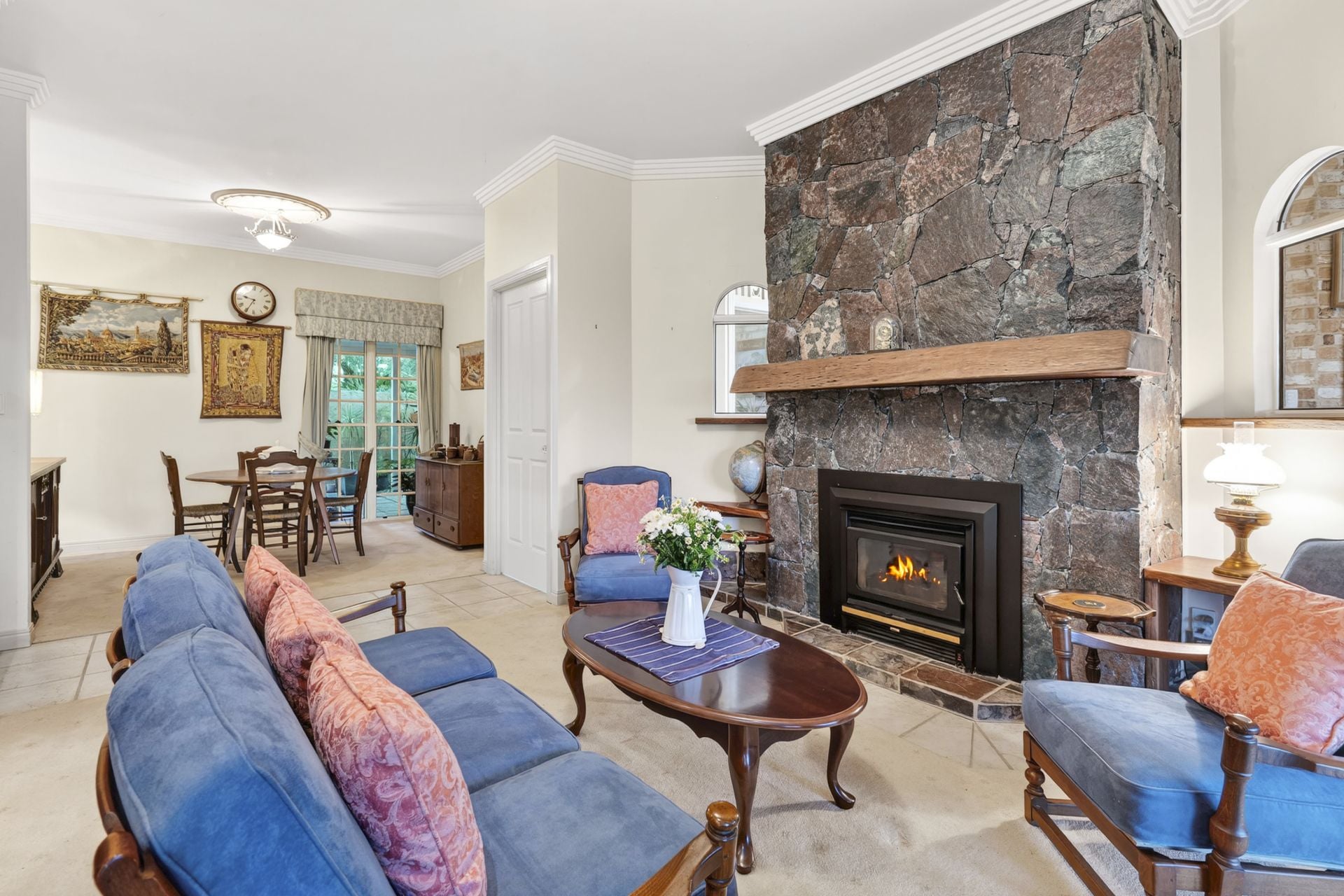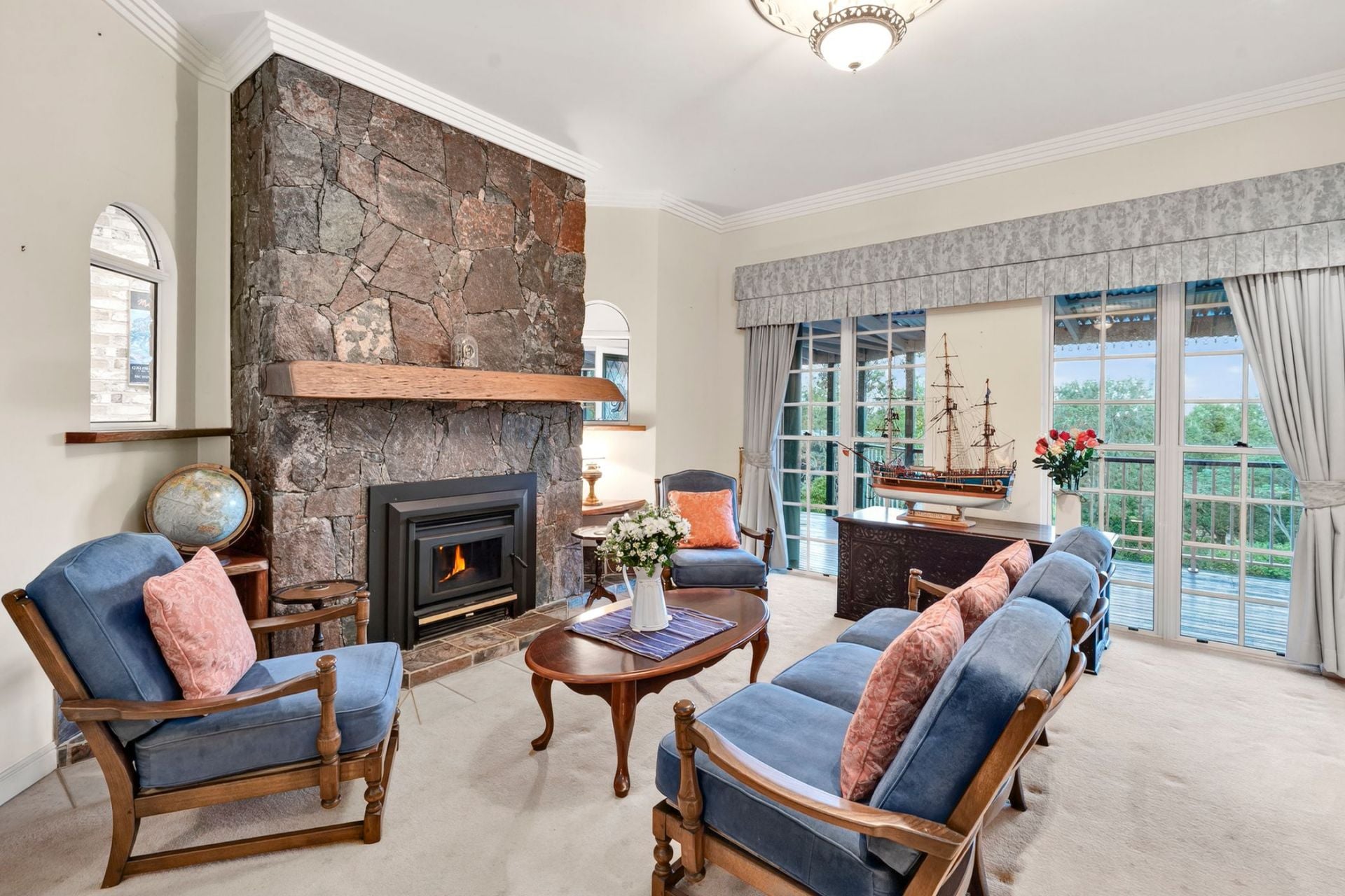 - Formal lounge showcases a stone fireplace with thick timber mantle, decorative cornice and vintage light fittings. A full wall of windows with elegant, quality drapes and arched feature windows to the foyer