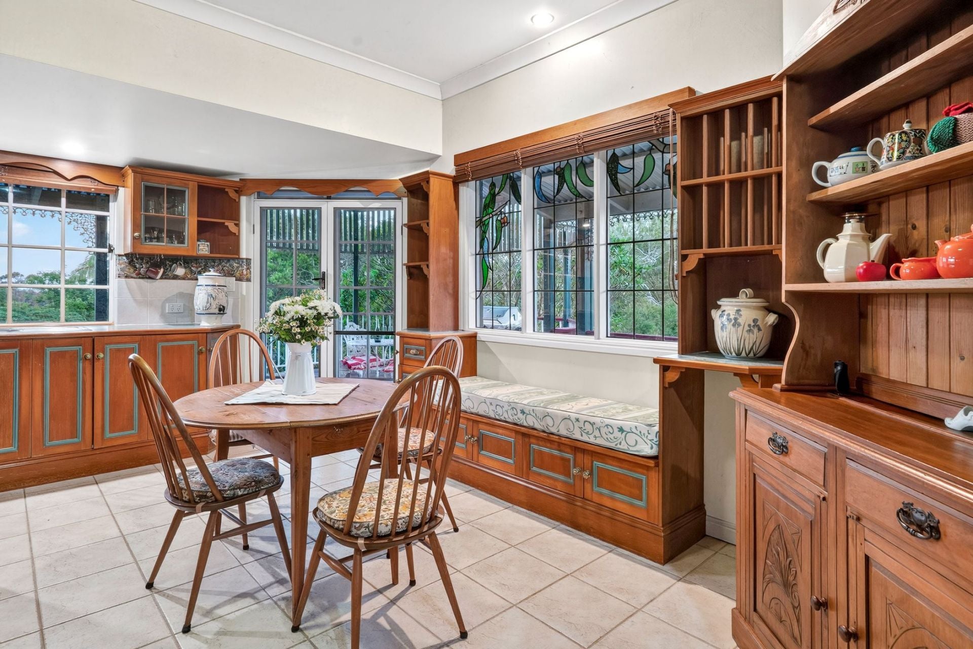 - The kitchen is truly the heart of this home with a brick mantle showcasing the dual timber and electric Homestead Cooker, these stoves offer the very best of old world charm and modern convenience. Redgum and New Guinea Rose, hand crafted cabinetry is complemented by the exquisite handmade leadlight feature window with window seat with wood storage, walk in pantry, additional electric wall oven and appliance nook