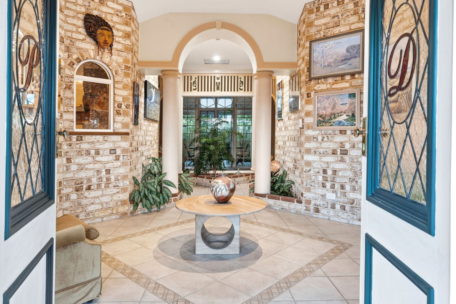 - Stunning double, timber lead light feature doors welcome you to a formal foyer with brick feature walls, soaring ceilings and decorative columns