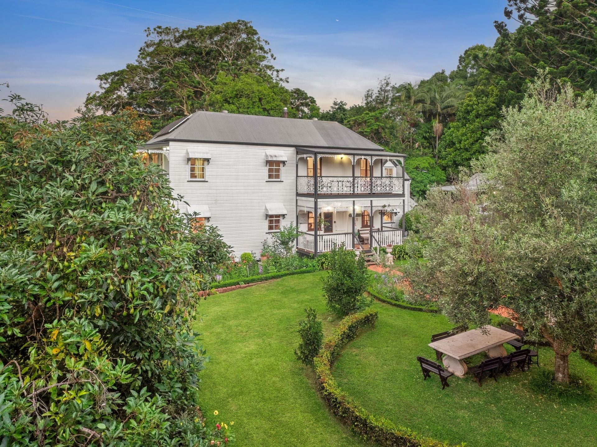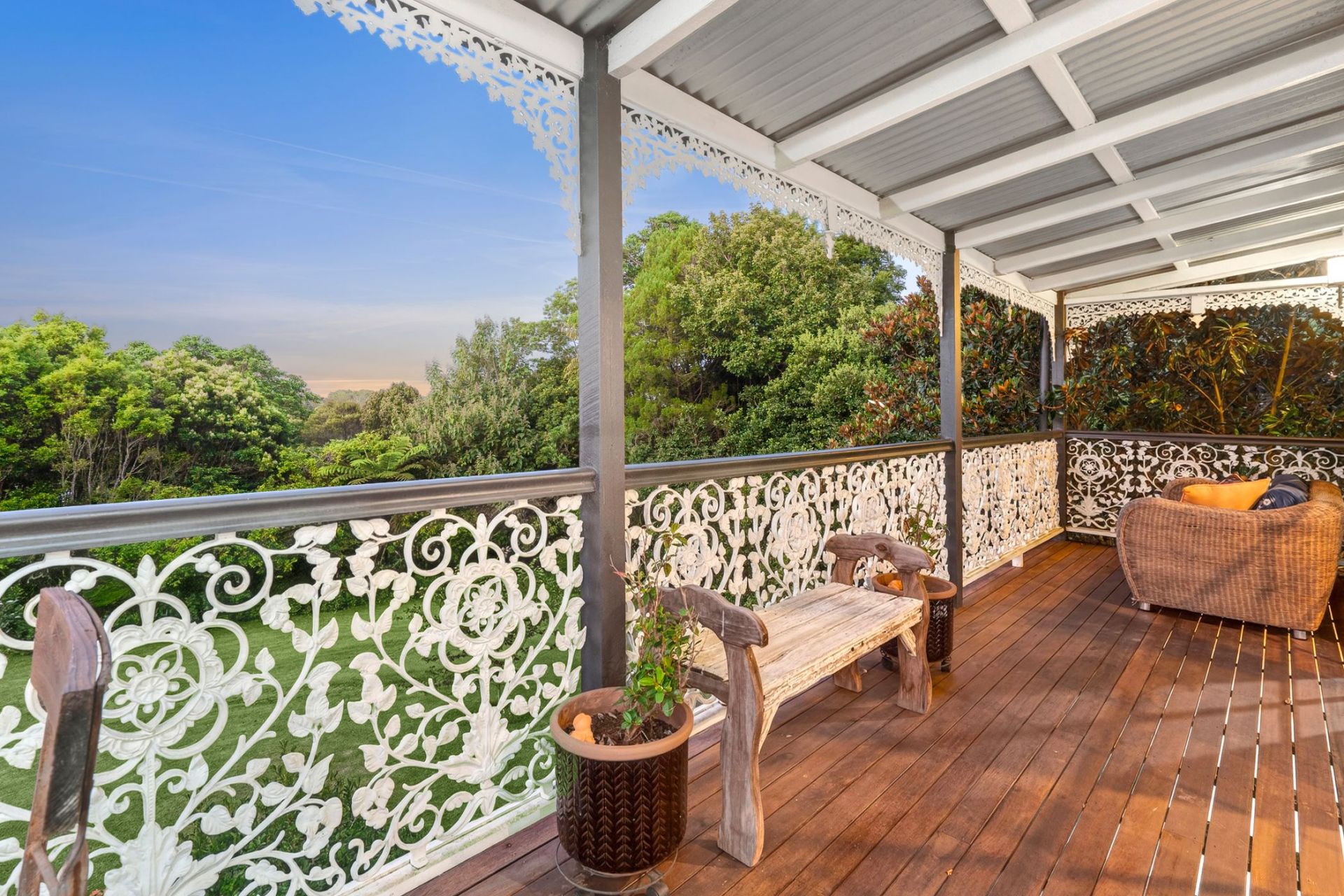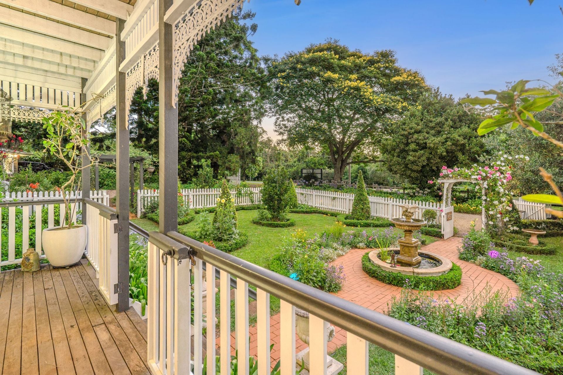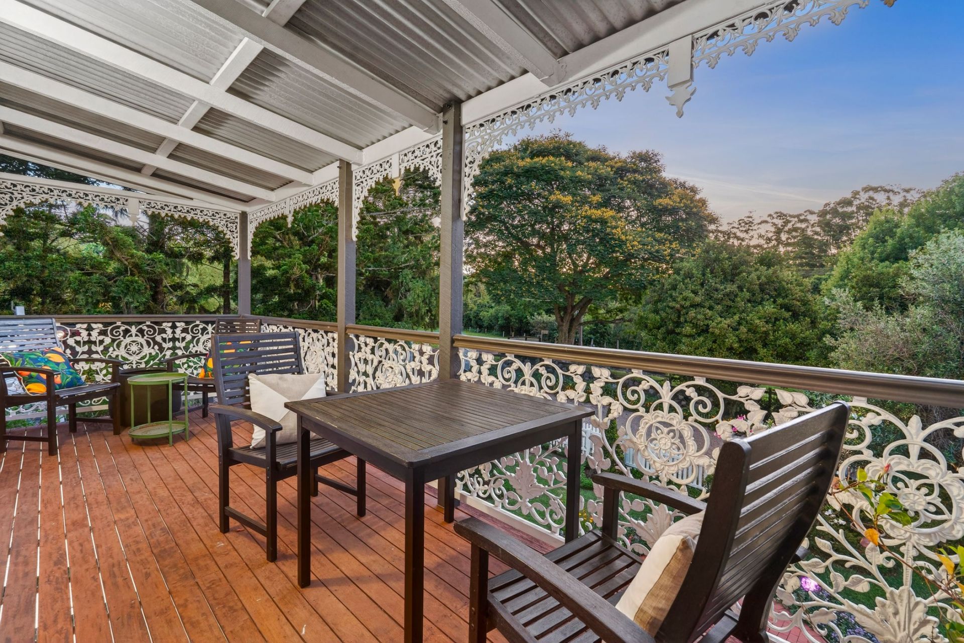Designed to embrace its picturesque surroundings, the home opens effortlessly to expansive outdoor living spaces, the wide verandahs finished with beautifully detailed wrought-iron balustrades and decorative fretwork, overlook the lush, established gardens and provide an idyllic setting for relaxed mornings, long lunches and peaceful evenings immersed in the tranquil outlook.