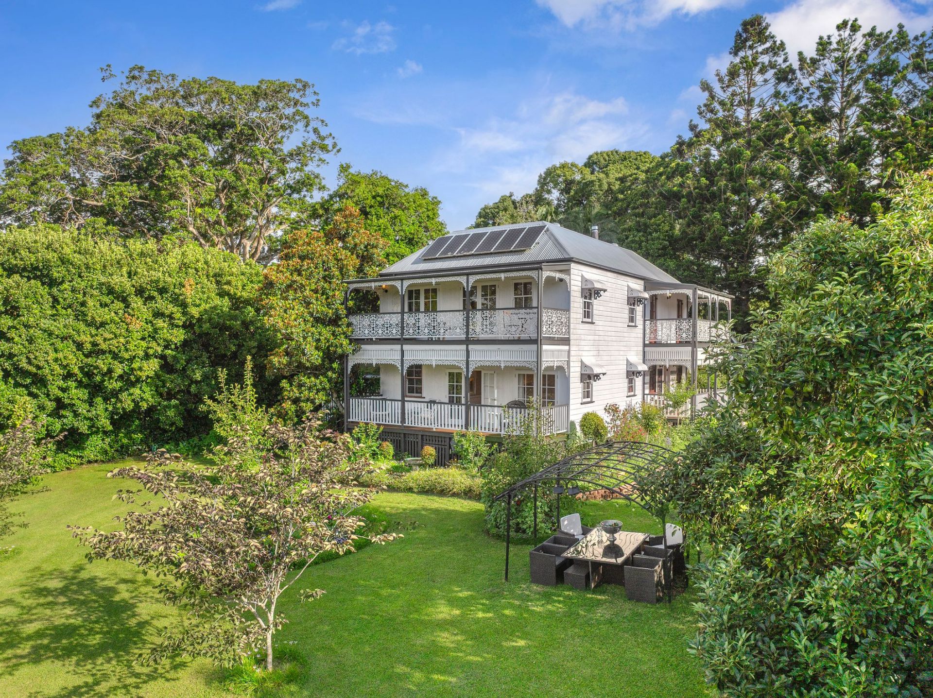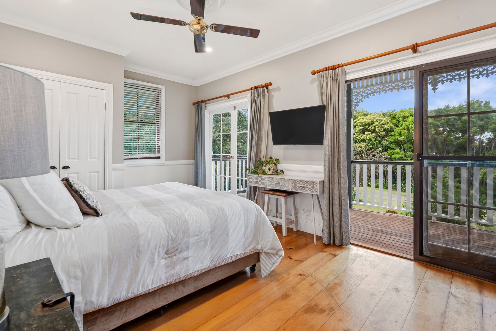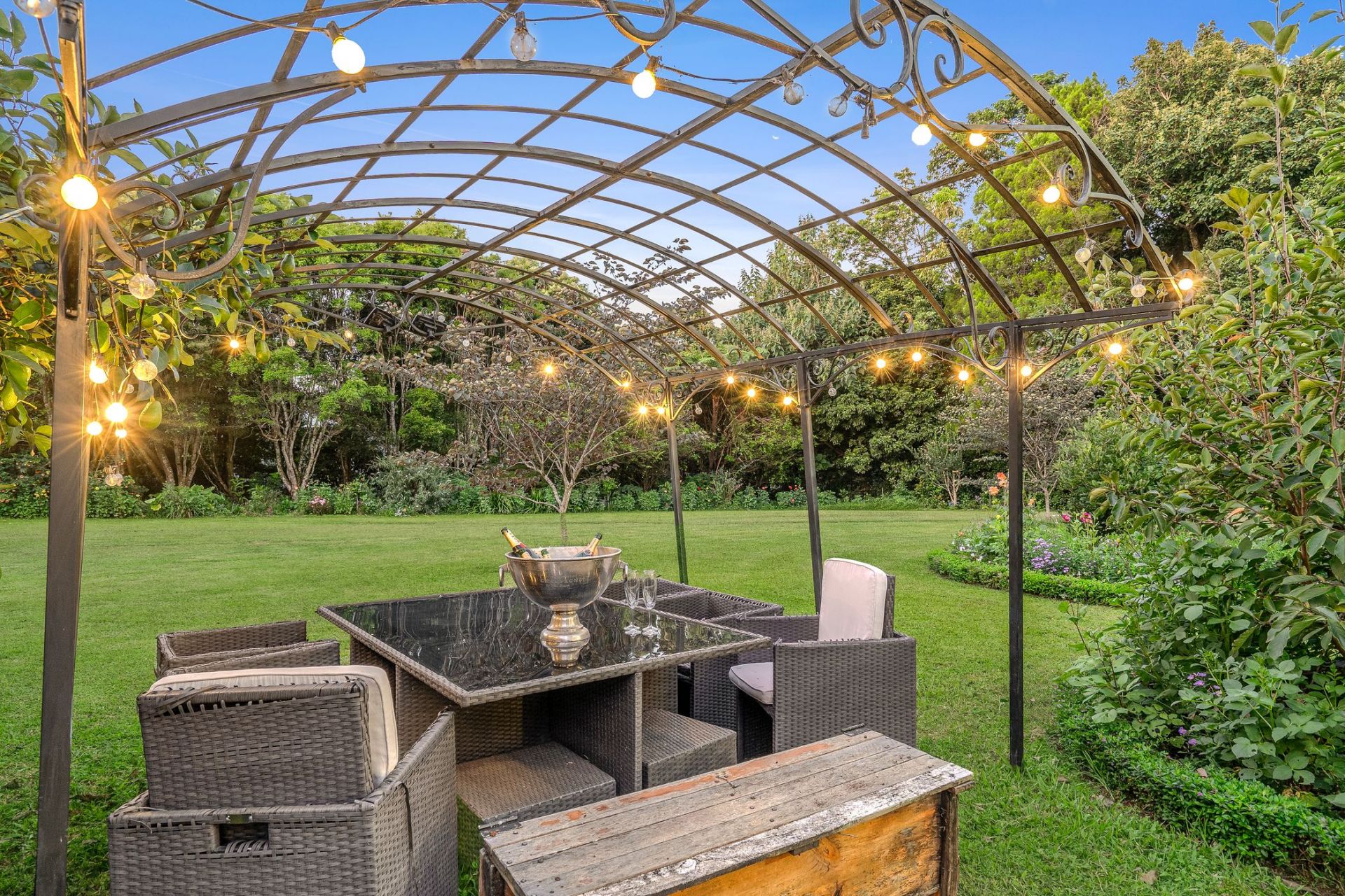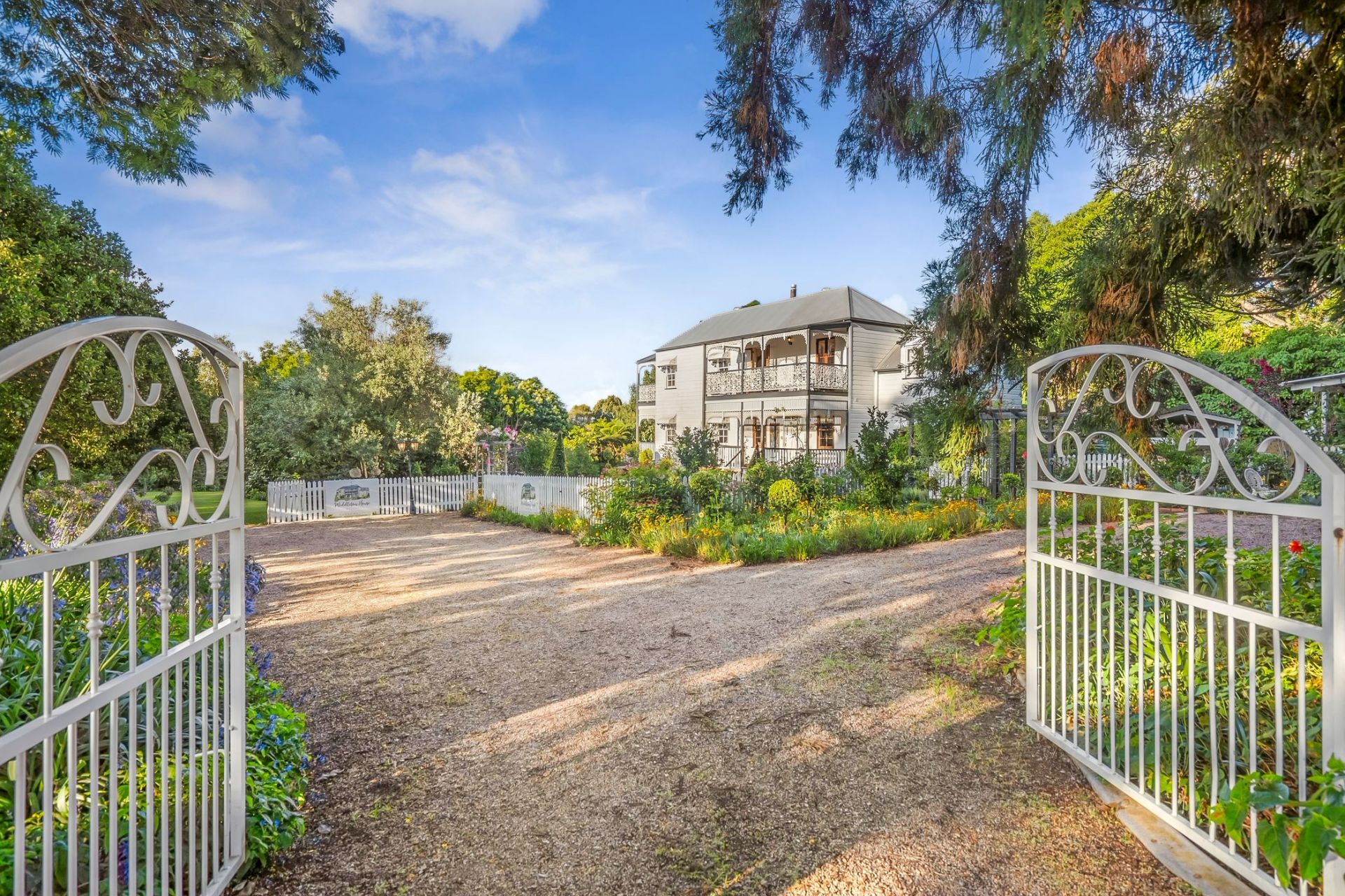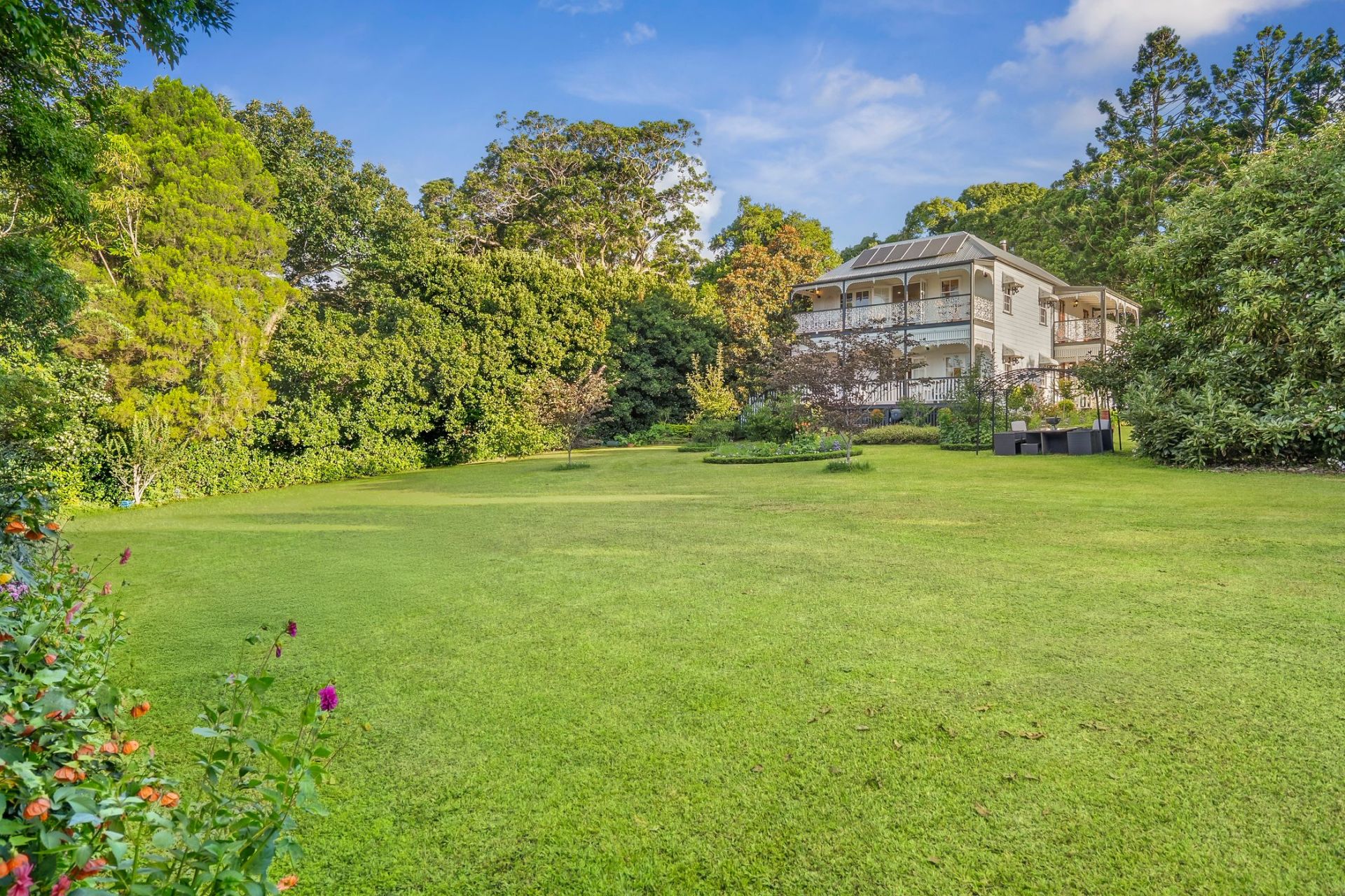 Designed to embrace its picturesque surroundings, the home opens effortlessly to expansive outdoor living spaces, the wide verandahs finished with beautifully detailed wrought-iron balustrades and decorative fretwork, overlook the lush, established gardens and provide an idyllic setting for relaxed mornings, long lunches and peaceful evenings immersed in the tranquil outlook.