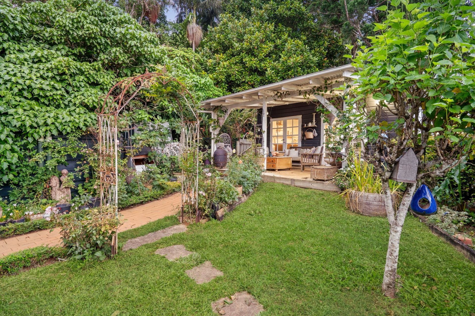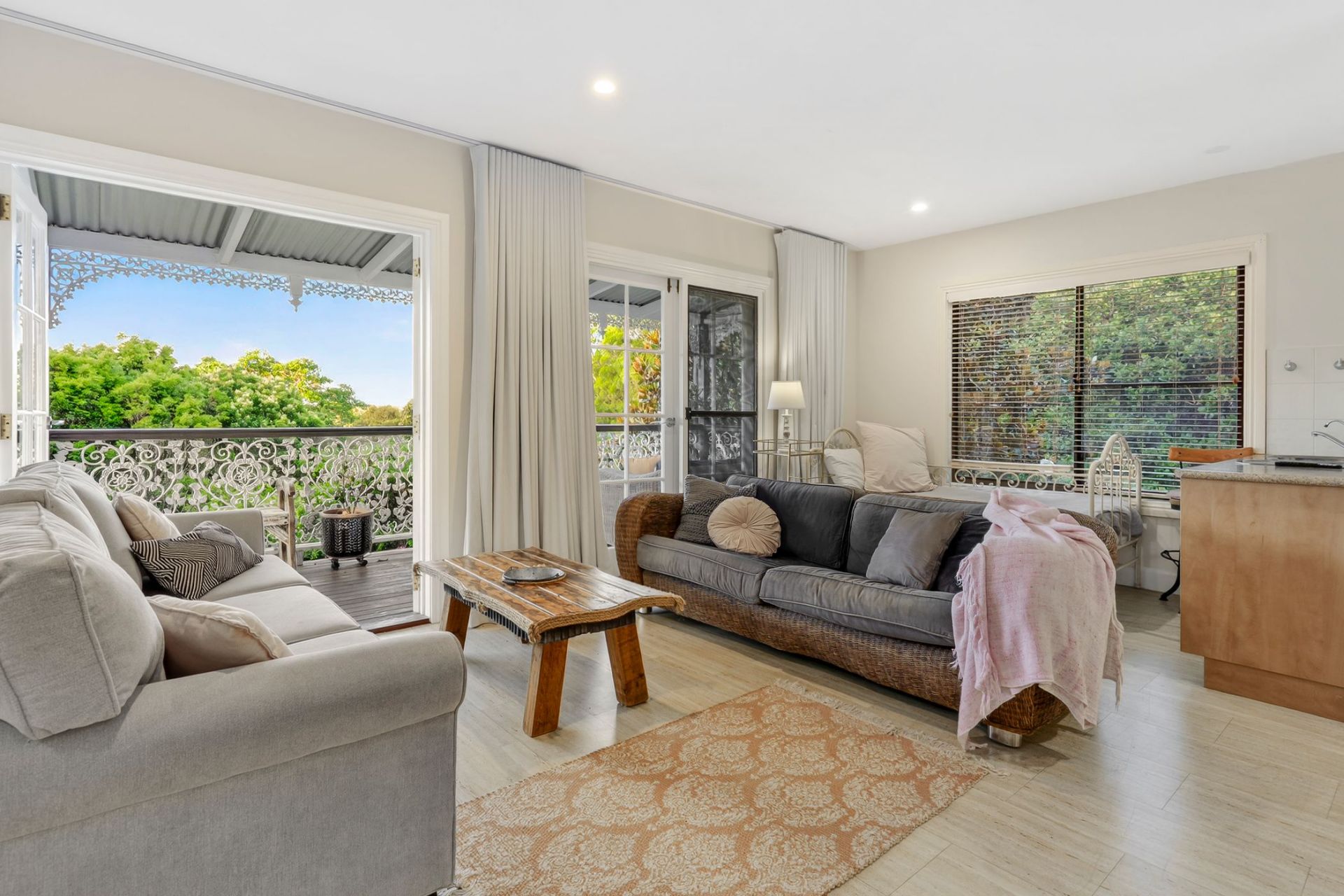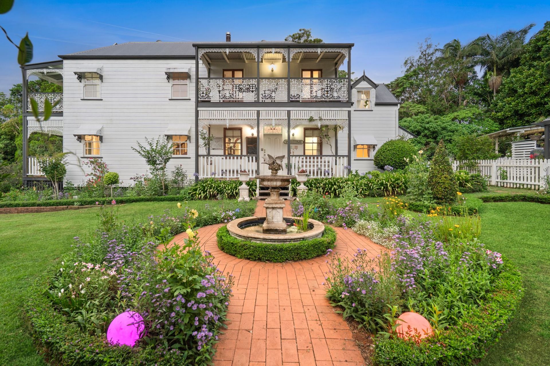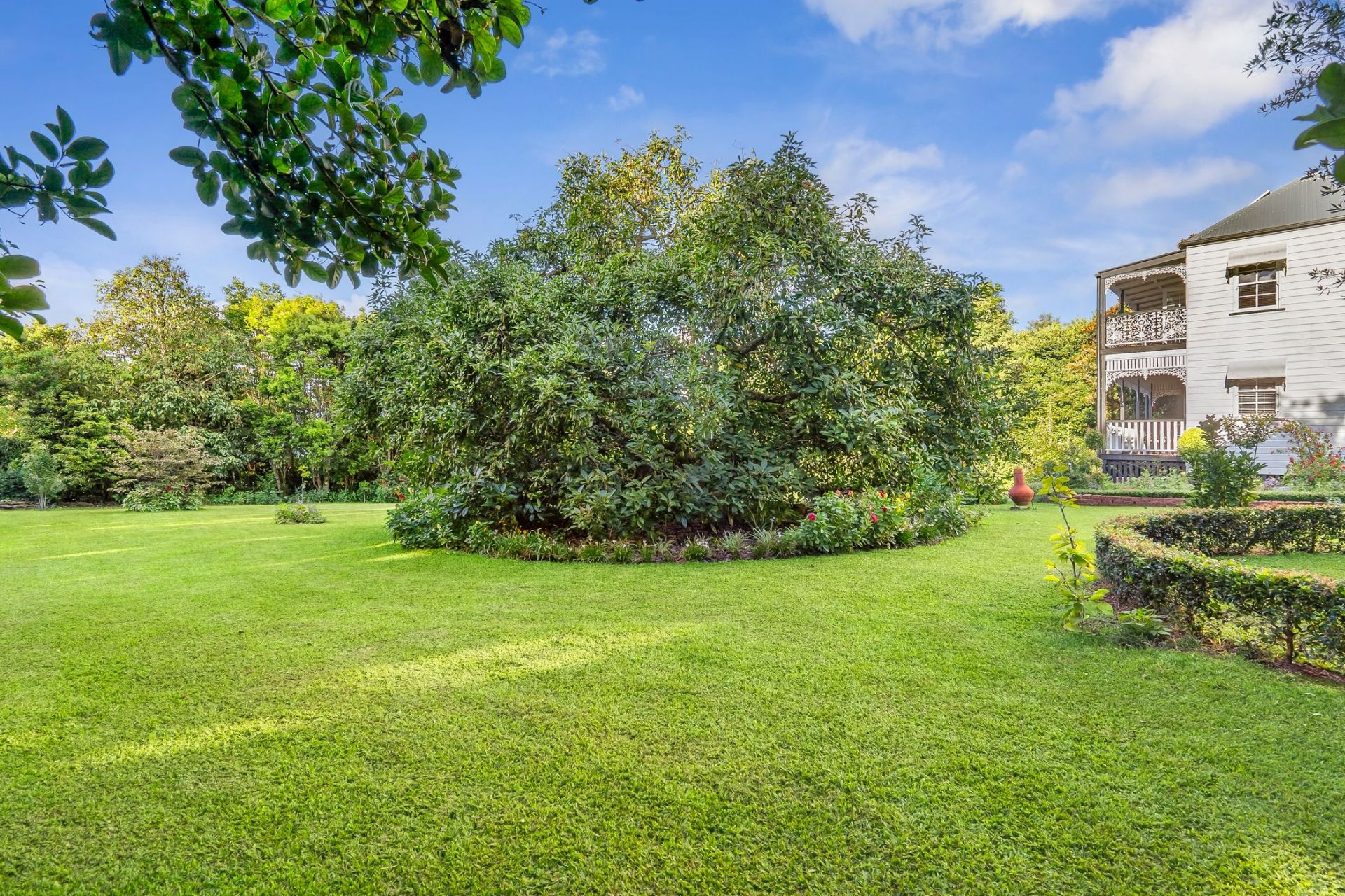 Designed to embrace its picturesque surroundings, the home opens effortlessly to expansive outdoor living spaces, the wide verandahs finished with beautifully detailed wrought-iron balustrades and decorative fretwork, overlook the lush, established gardens and provide an idyllic setting for relaxed mornings, long lunches and peaceful evenings immersed in the tranquil outlook.