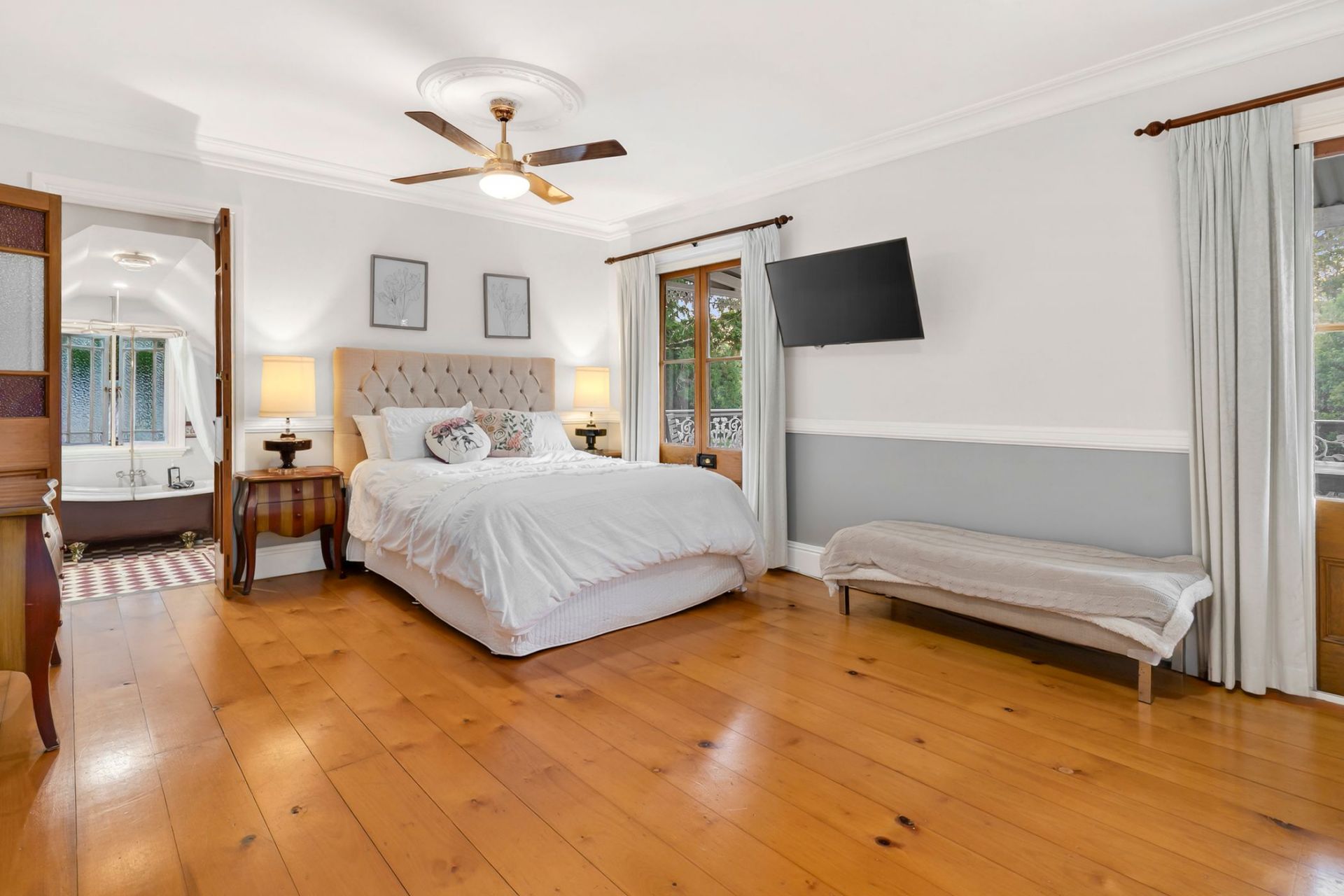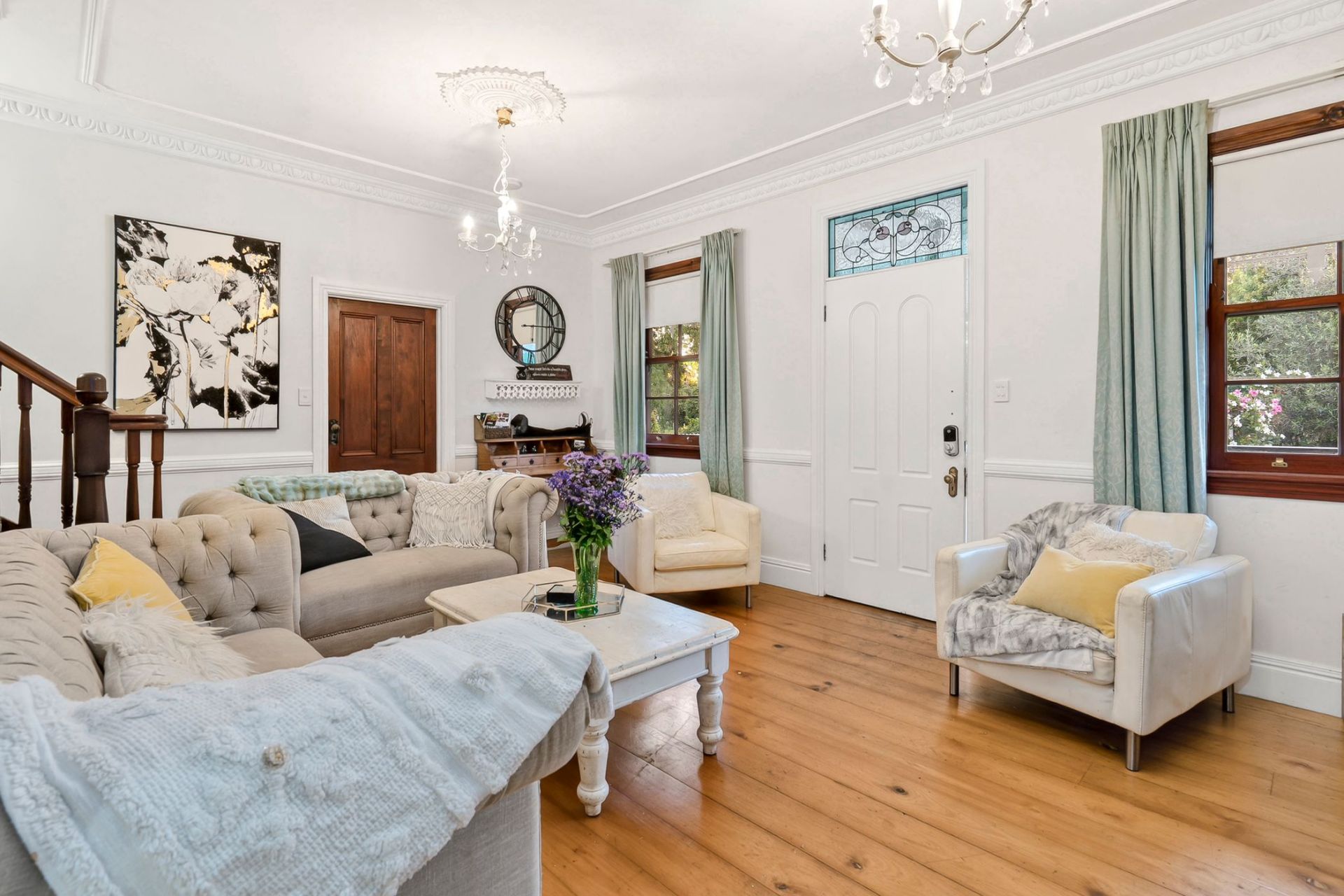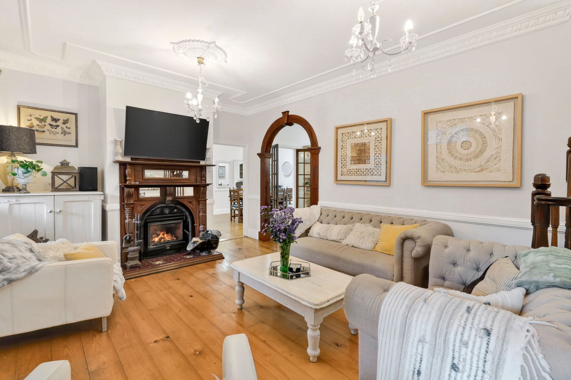 - High ceilings with decorative cornices and ceiling roses, enhancing the sense of space and character