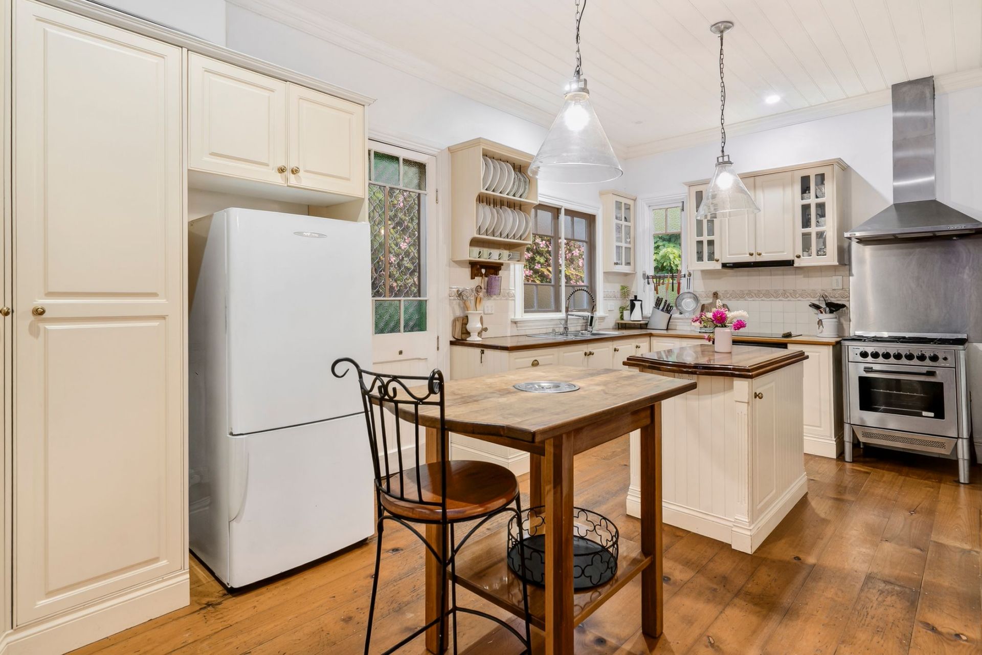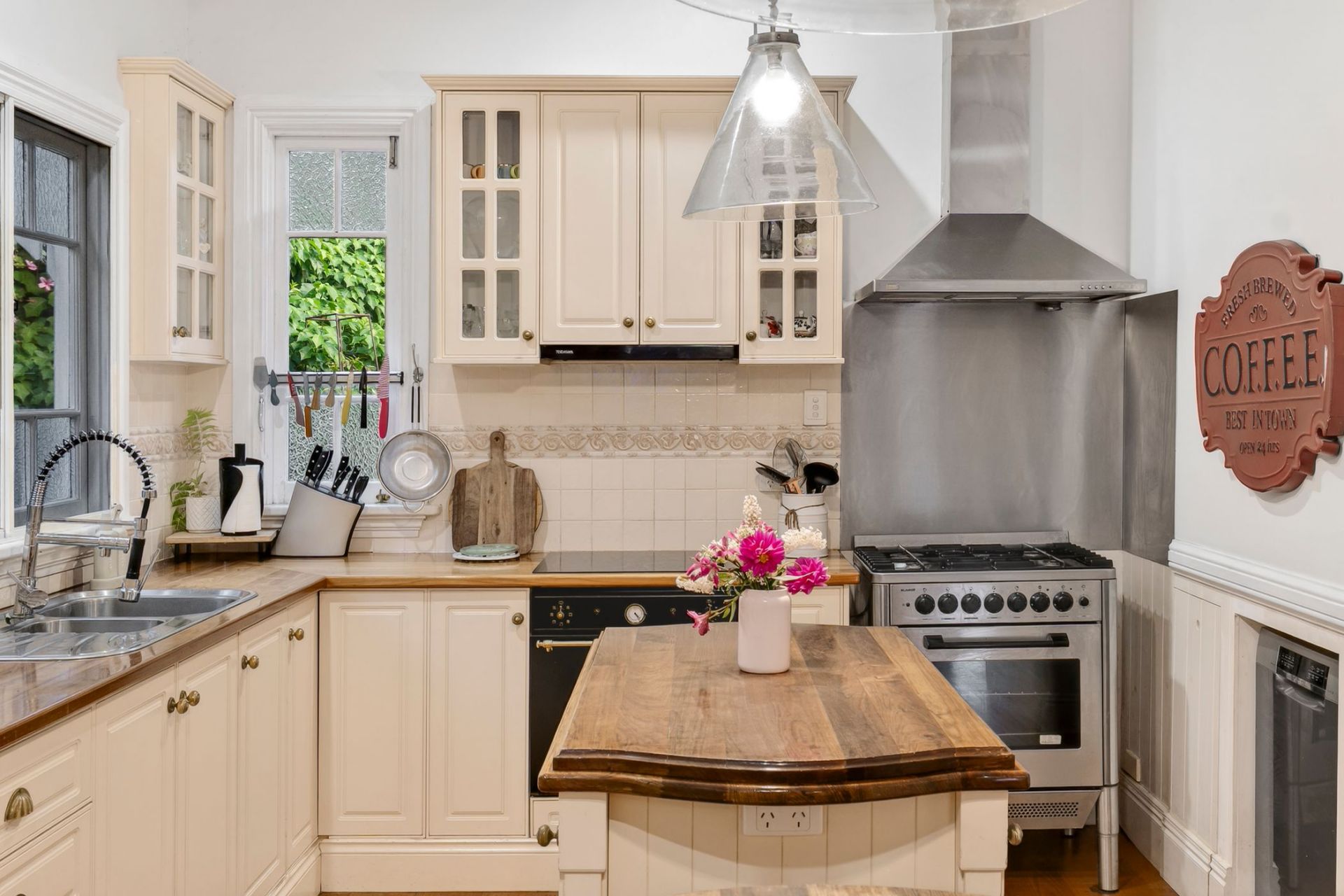 - Charming country style kitchen features wooden bench tops and ample storage, it is equipped with a gas stove and oven plus separate ceramic cooktop and oven