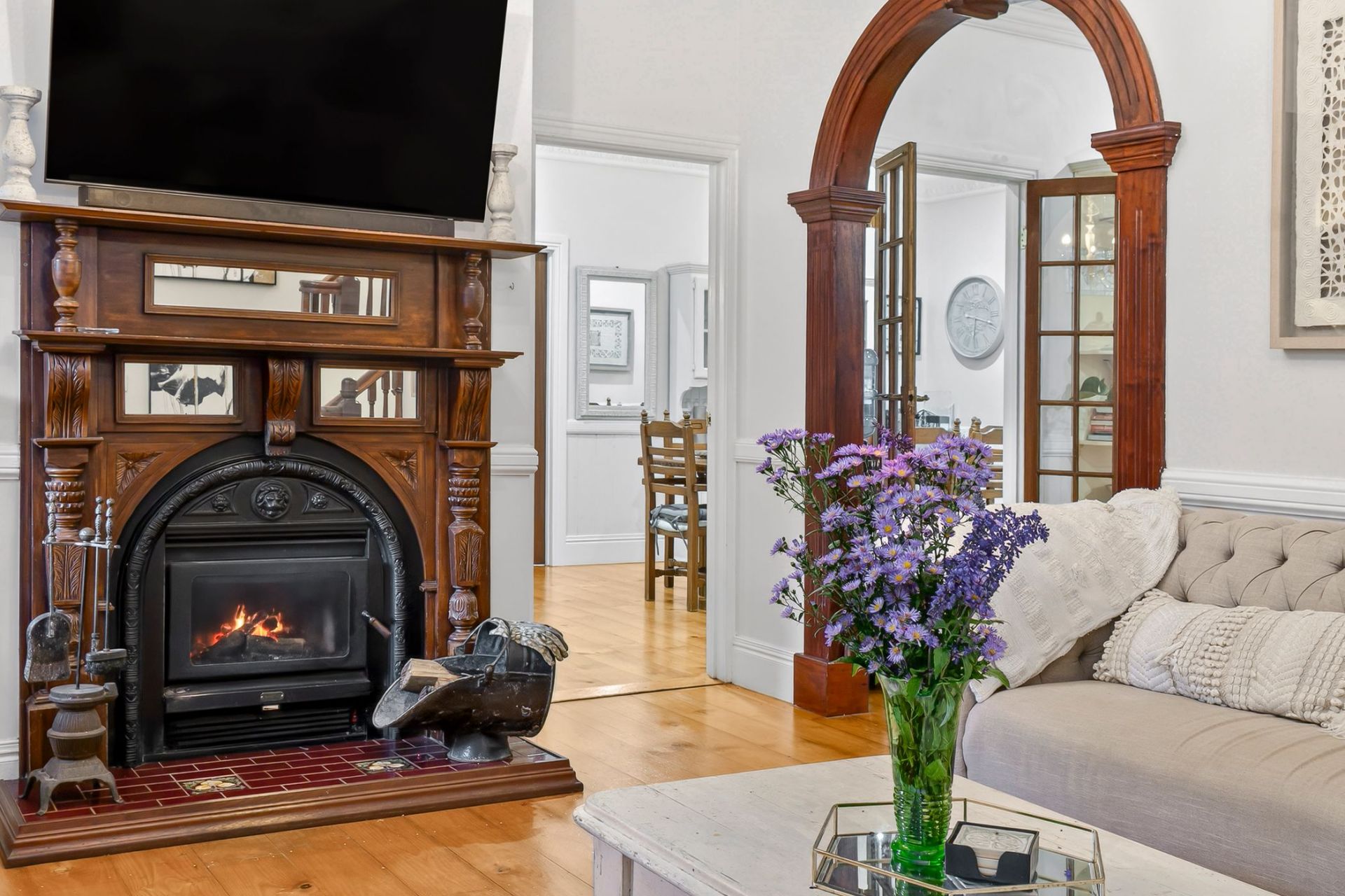 - Inviting lounge room with stunning original timber fireplace with ornate detailing and gorgeous timber archway connecting to the kitchen plus Reverse cycle air conditioning