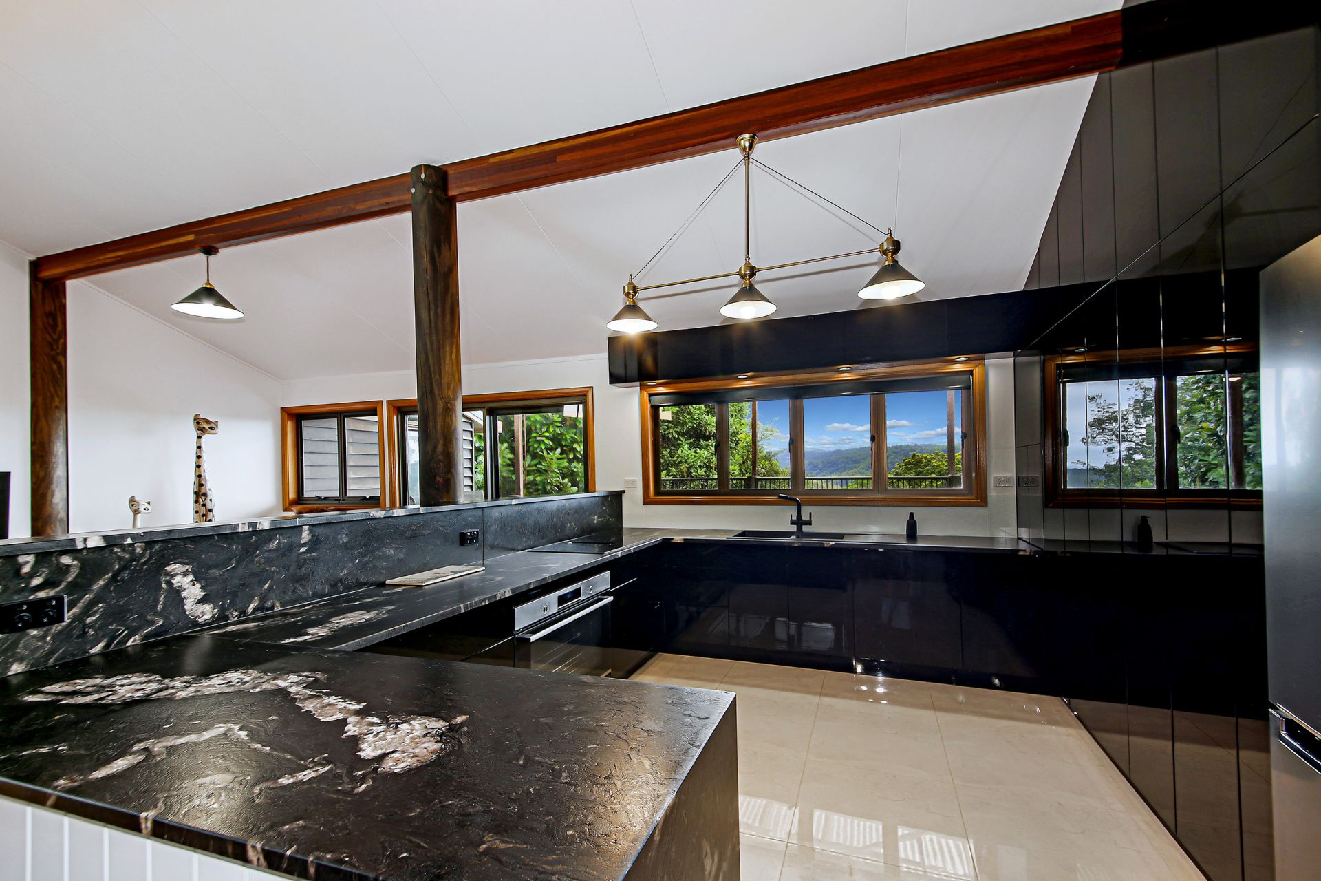 - Recently renovated kitchen with stunning waterfall, Titanium Gold granite, bench tops, electric activated drawers, 2 Pac cabinetry, stylish black tap ware, industrial style feature pendant lights, huge amount of storage and bench space, down draft induction cooktop, filtered water, Bosch pyrolytic oven, Asko integrated dishwasher