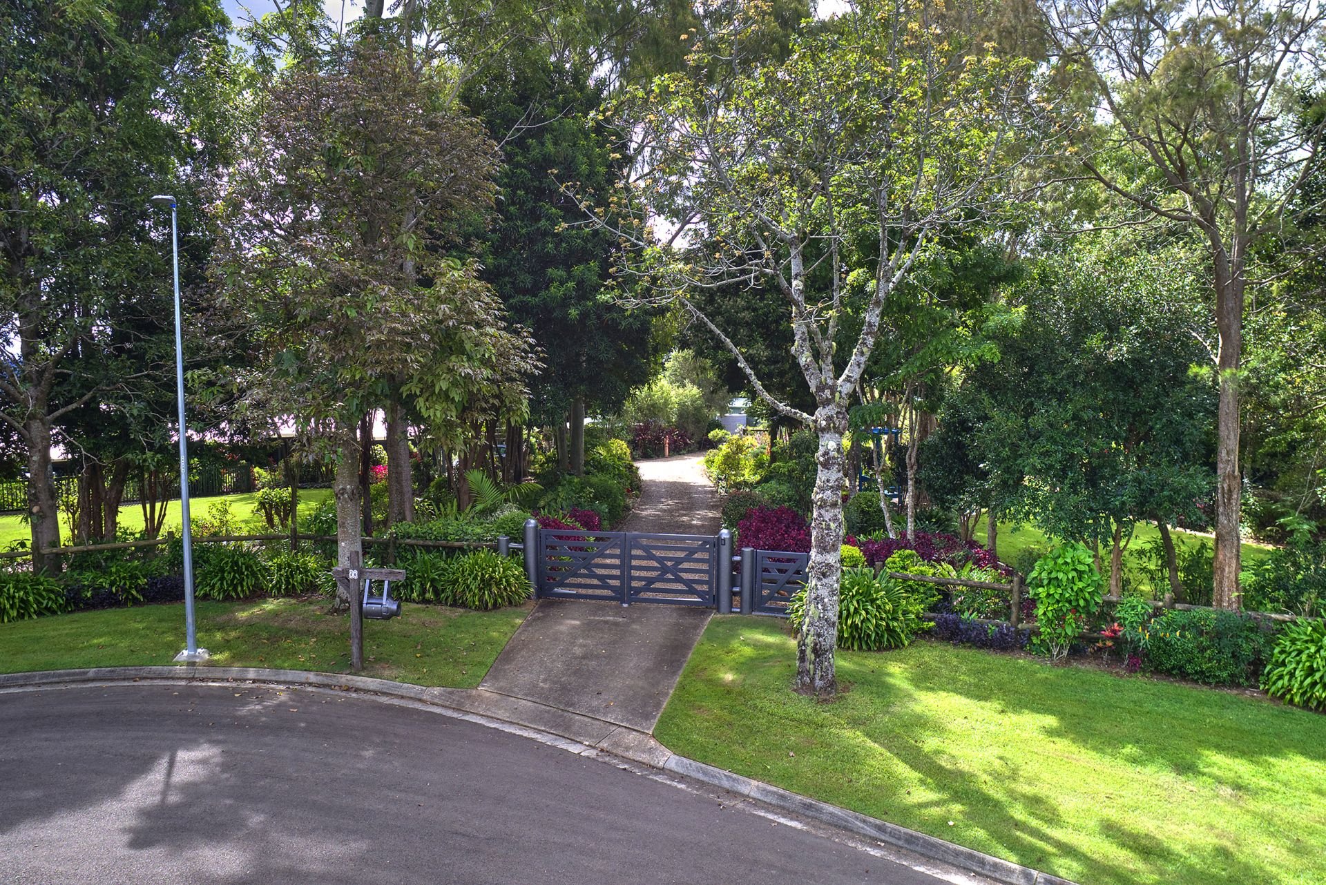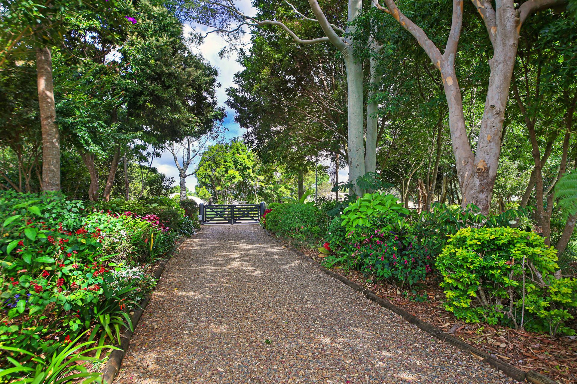 - Private driveway with secure, electric, keypad entry gate and lined with colourful plants and flowering trees
