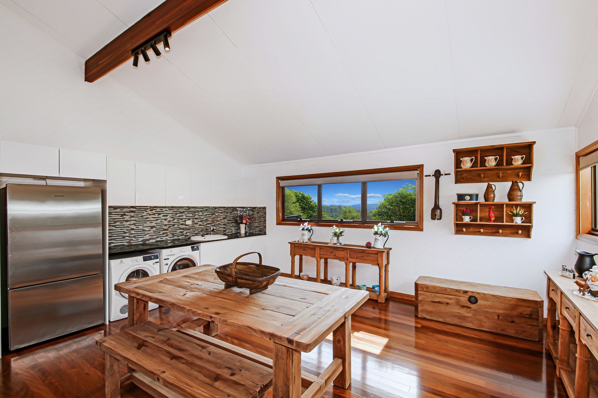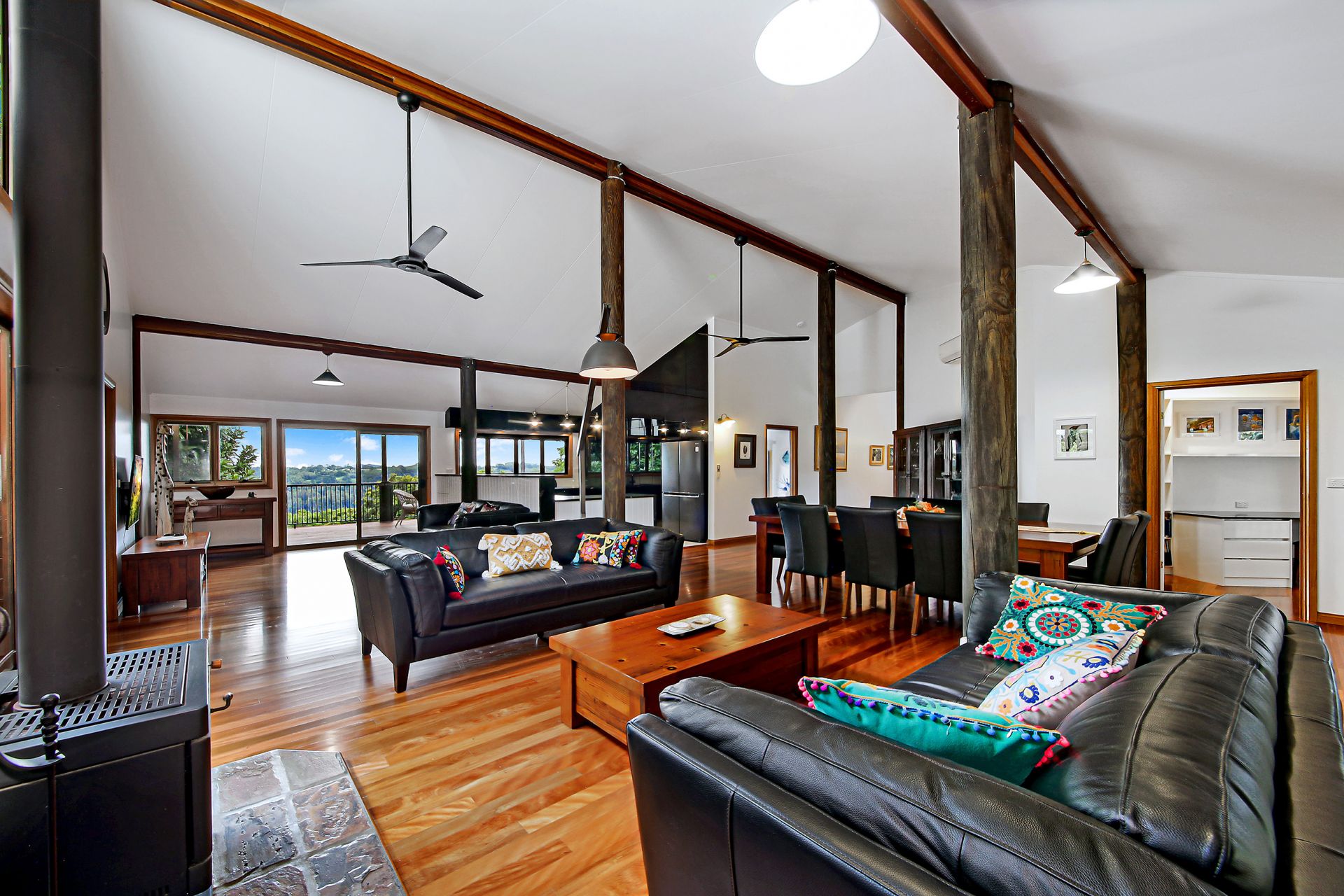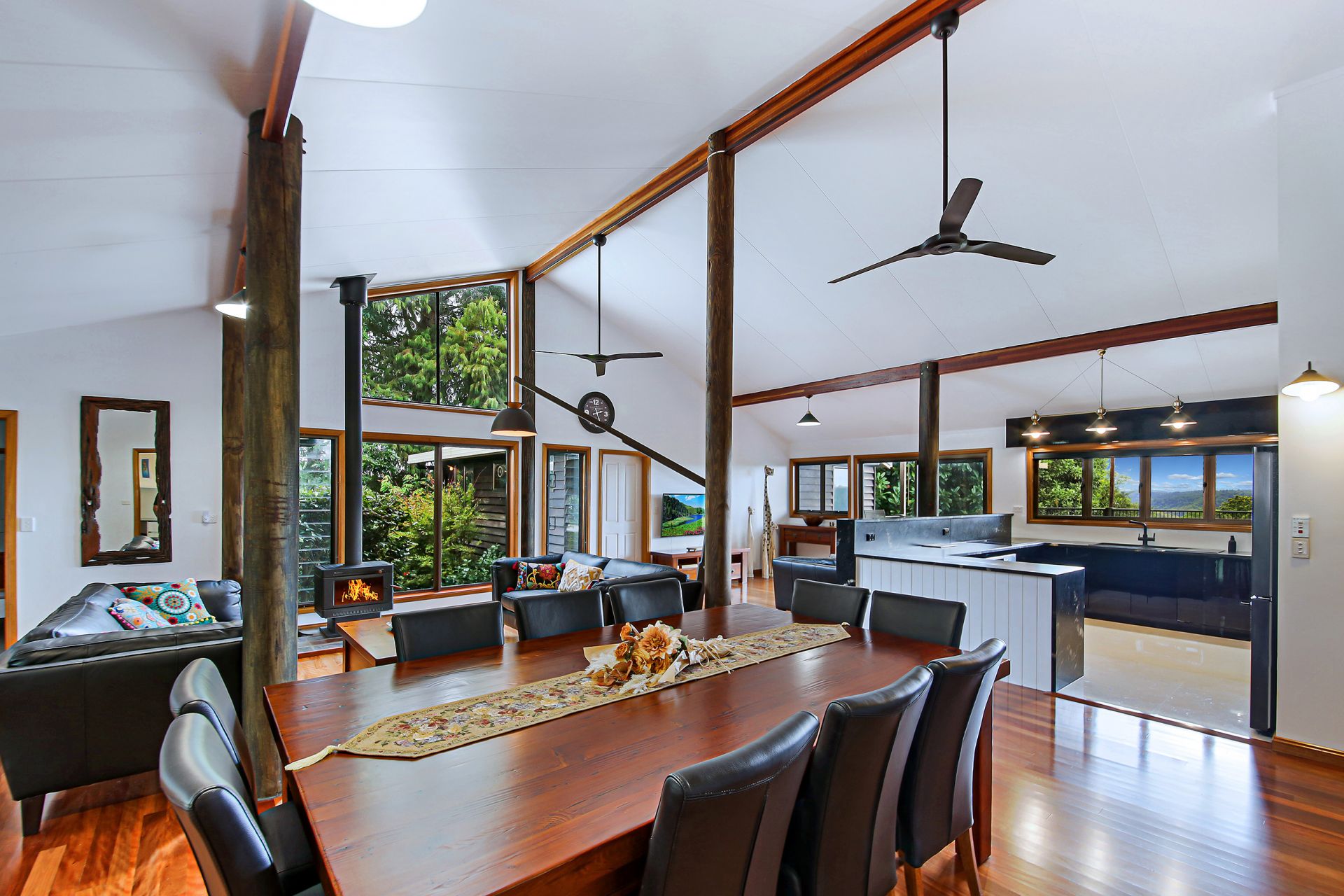 - Cosy fireplace, insulated panel, soaring apex ceilings with feature, exposed timber posts, stunning spotted gum flooring and large glass sliding doors to the verandah with magic valley views