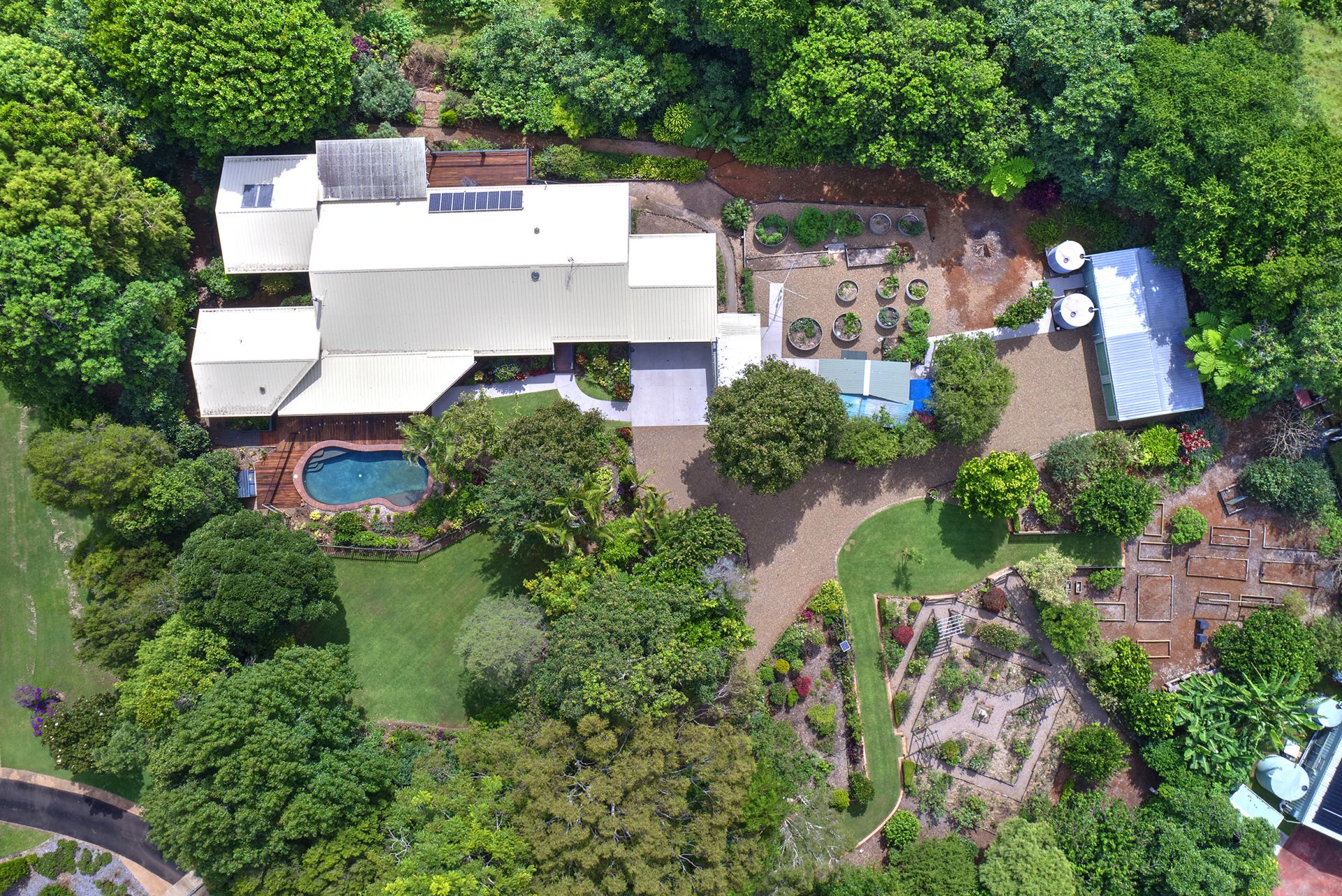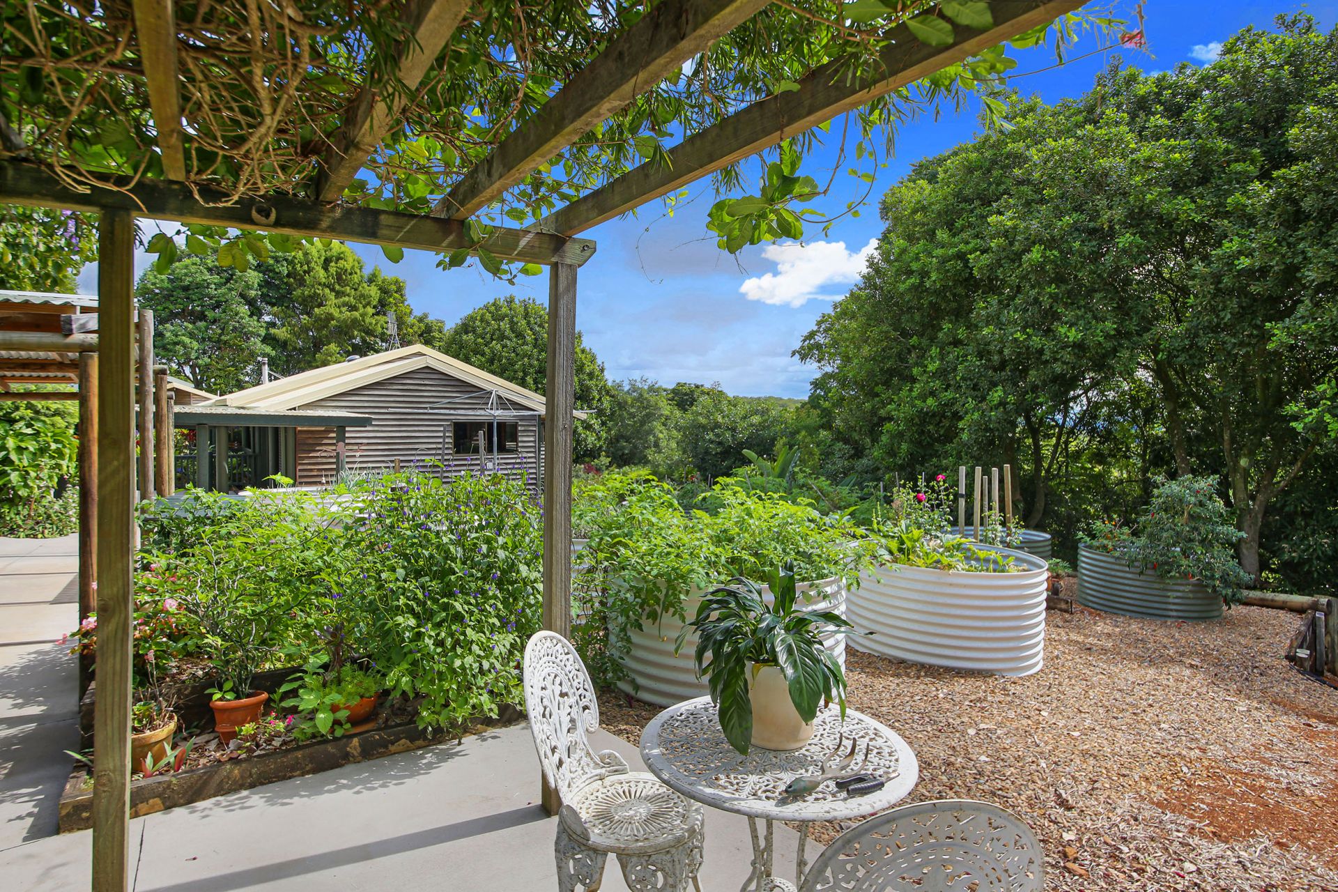 - Potting shed with raised garden beds and covered walkway to the house
