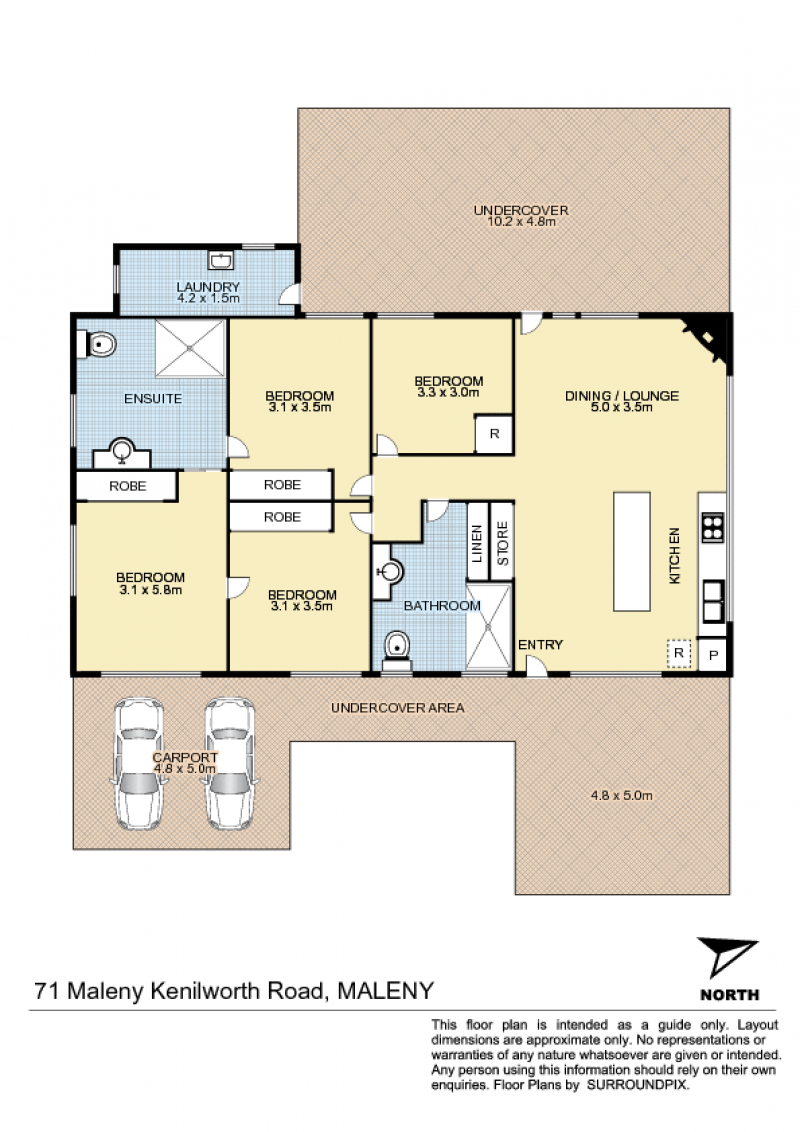 - Two covered car ports at the front of the home with undercover access to the front door and kitchen