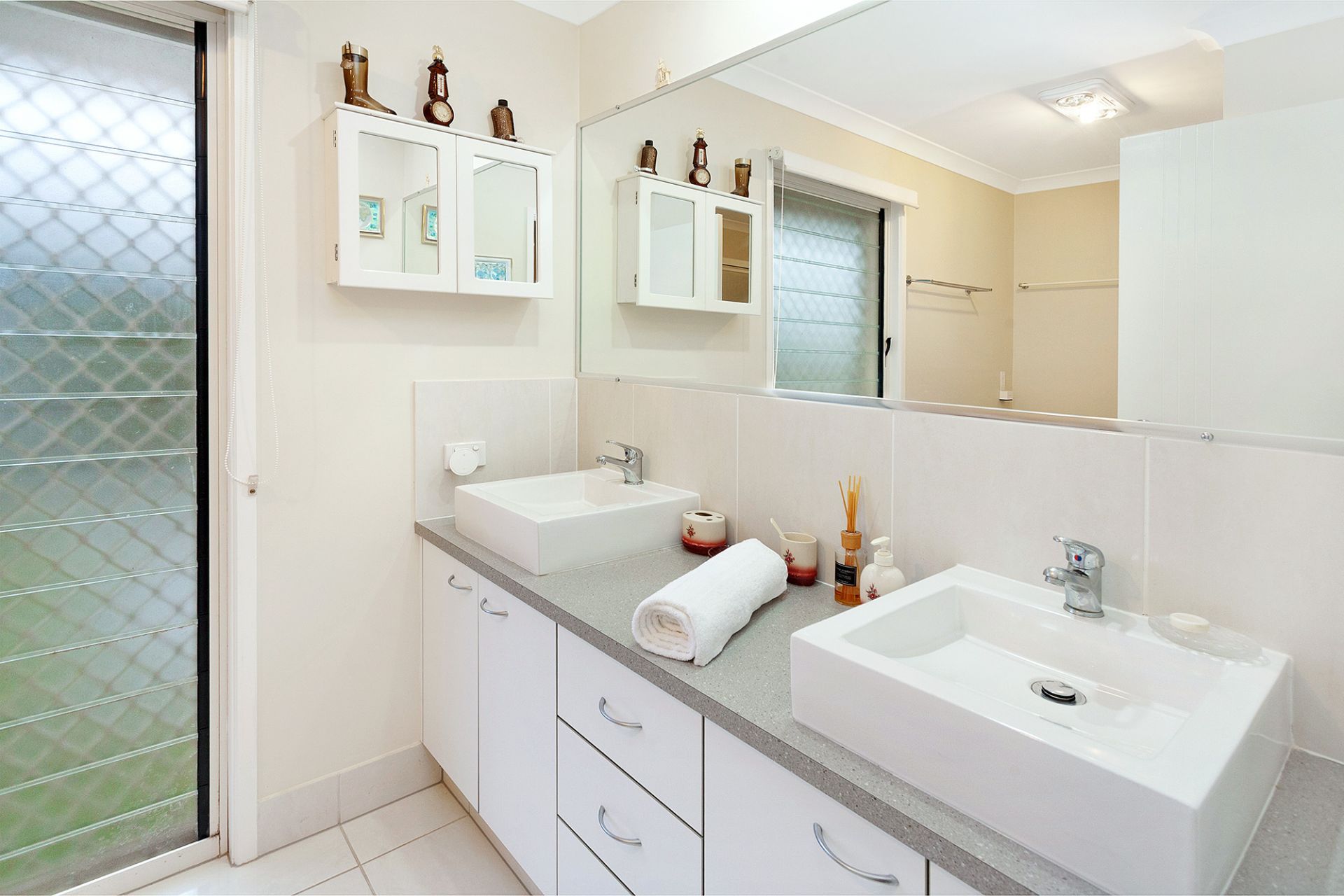Security doors at the large, pivoting timber and glass front door and laundry door