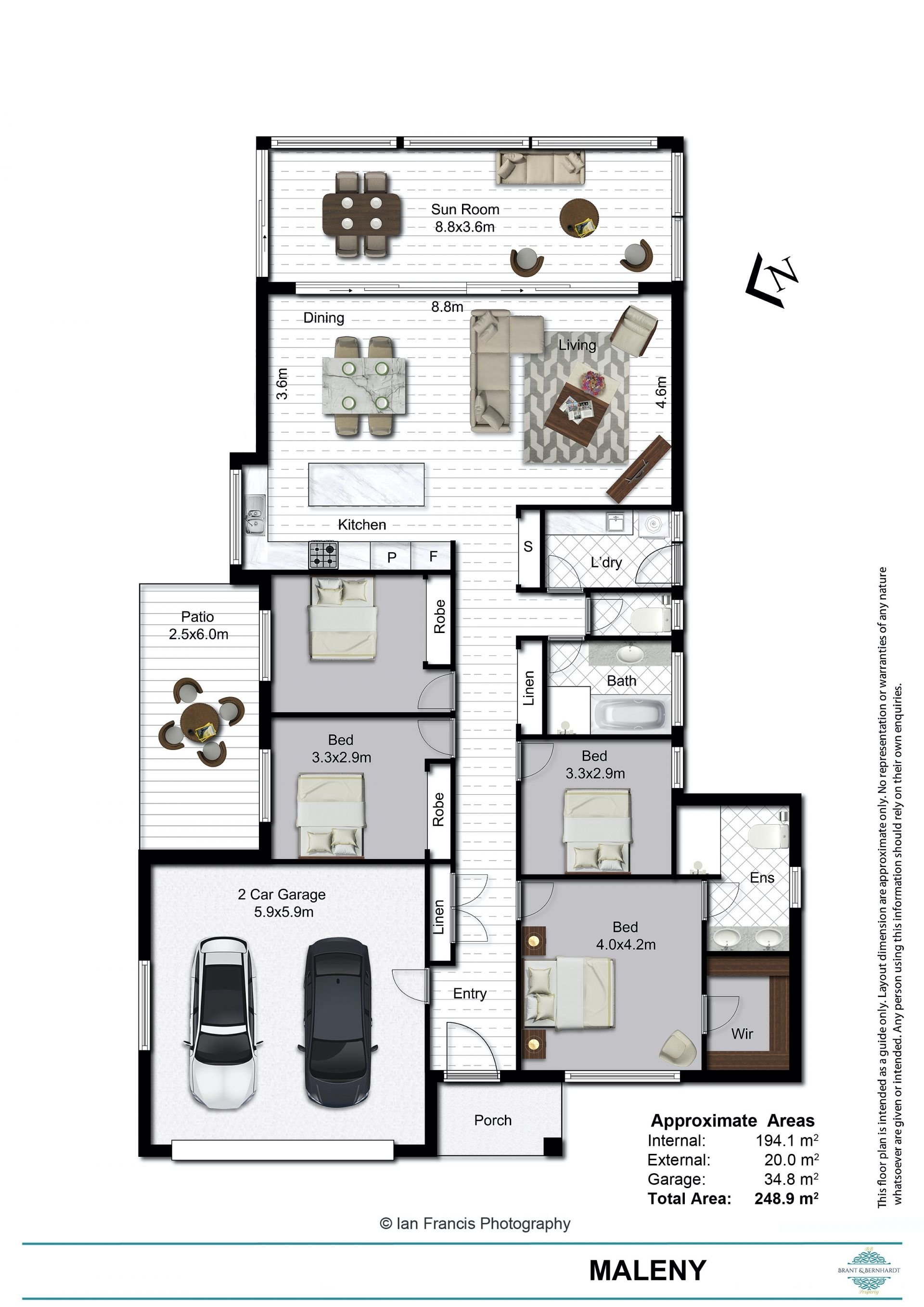 4 Bedrooms, large master with ensuite featuring double sinks, large shower and walk in robe, 3rd bedroom currently used as an office, 2 spacious guest bedrooms with built in robes, ceiling fans and large, North facing windows