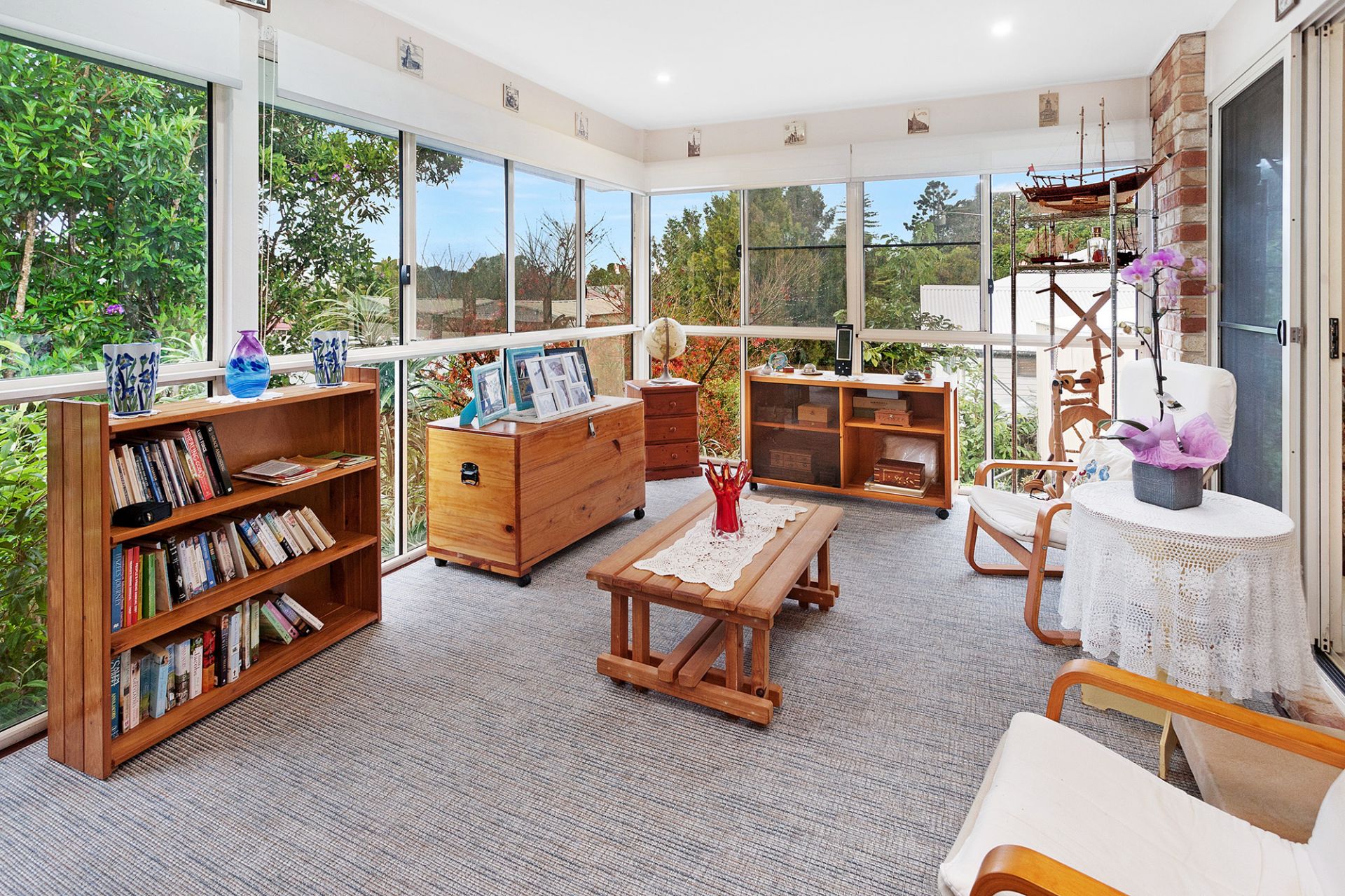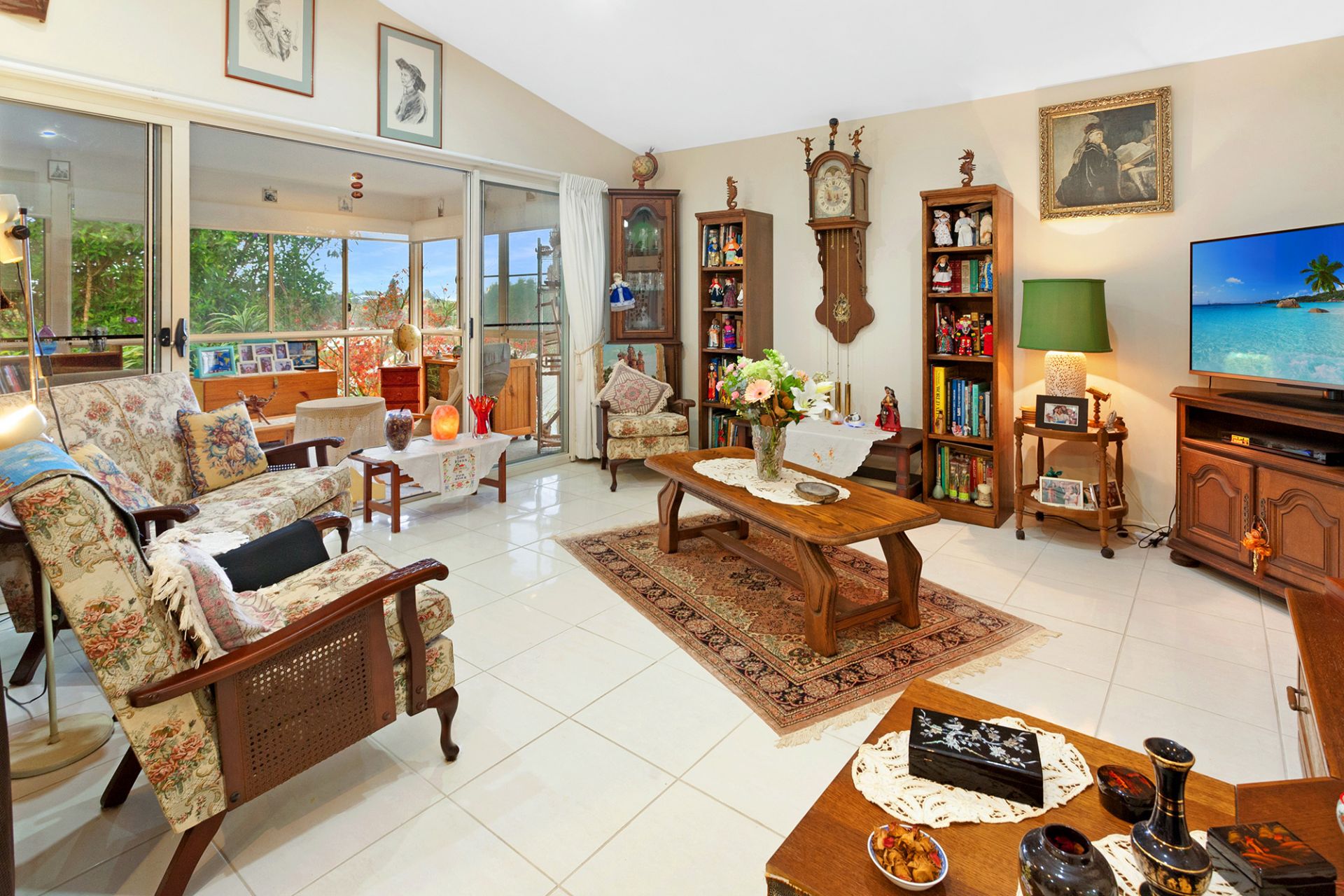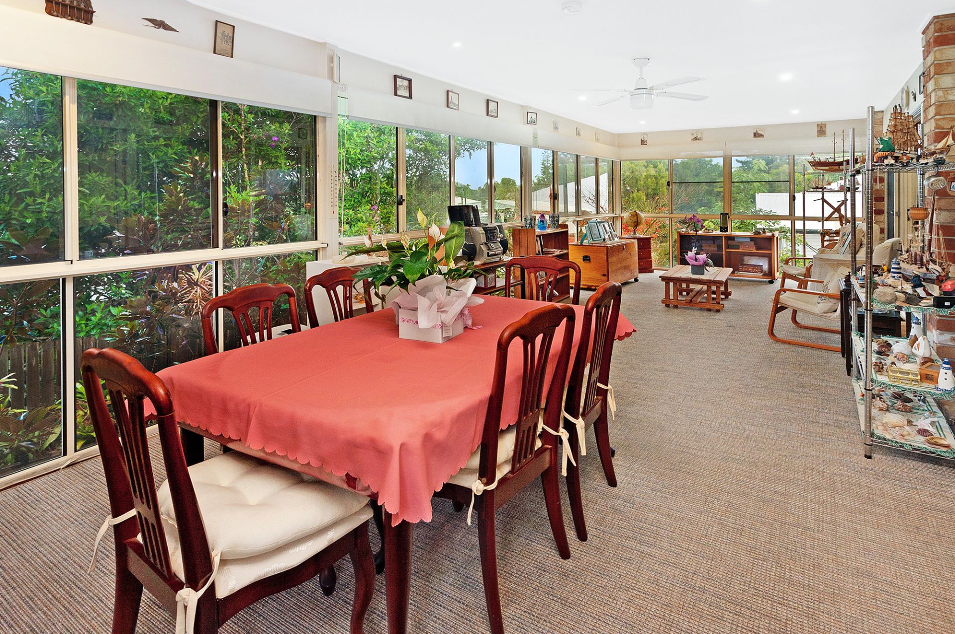 Lovely open plan living, dining, lounge area with soaring apex ceilings opening to a full-length, enclosed sunroom with tinted glass