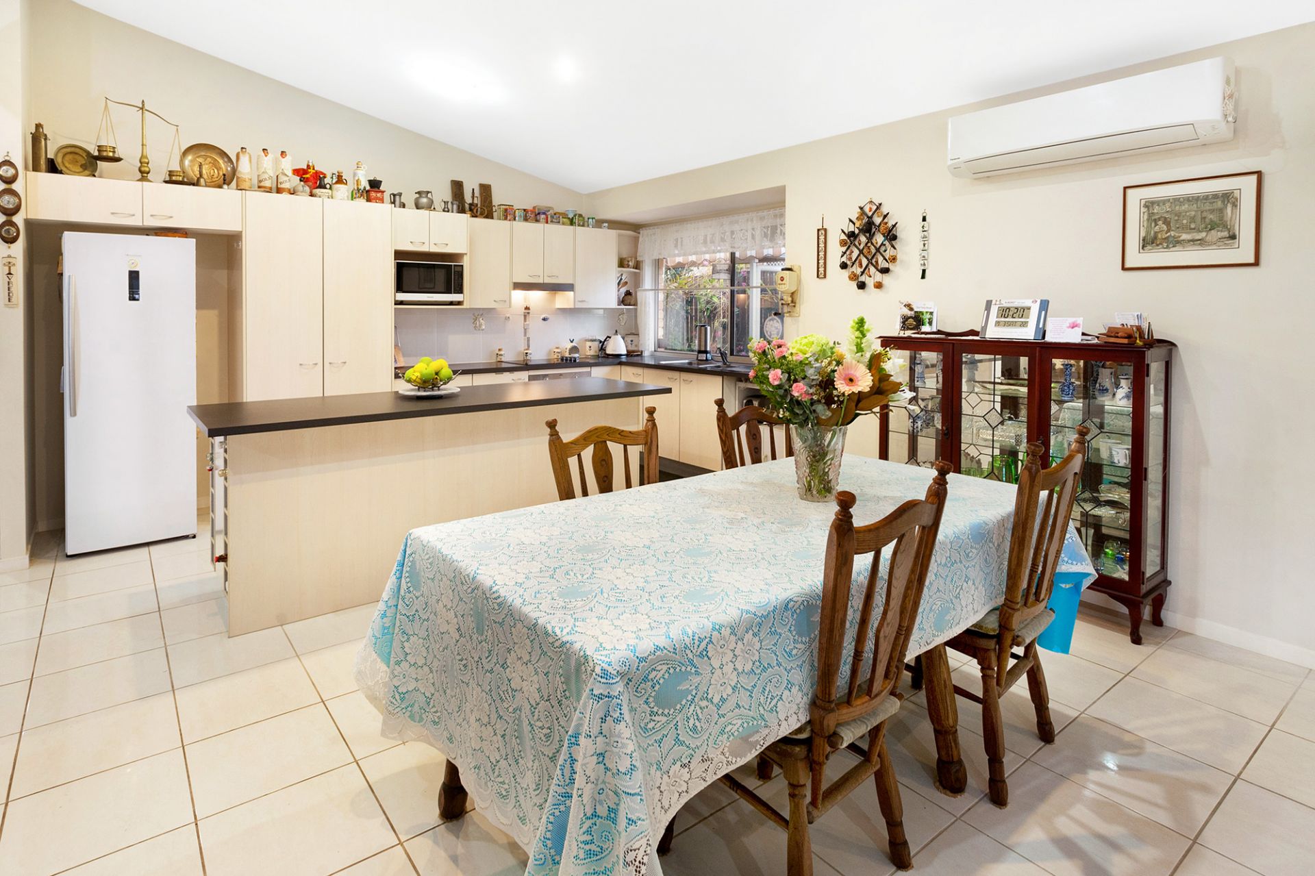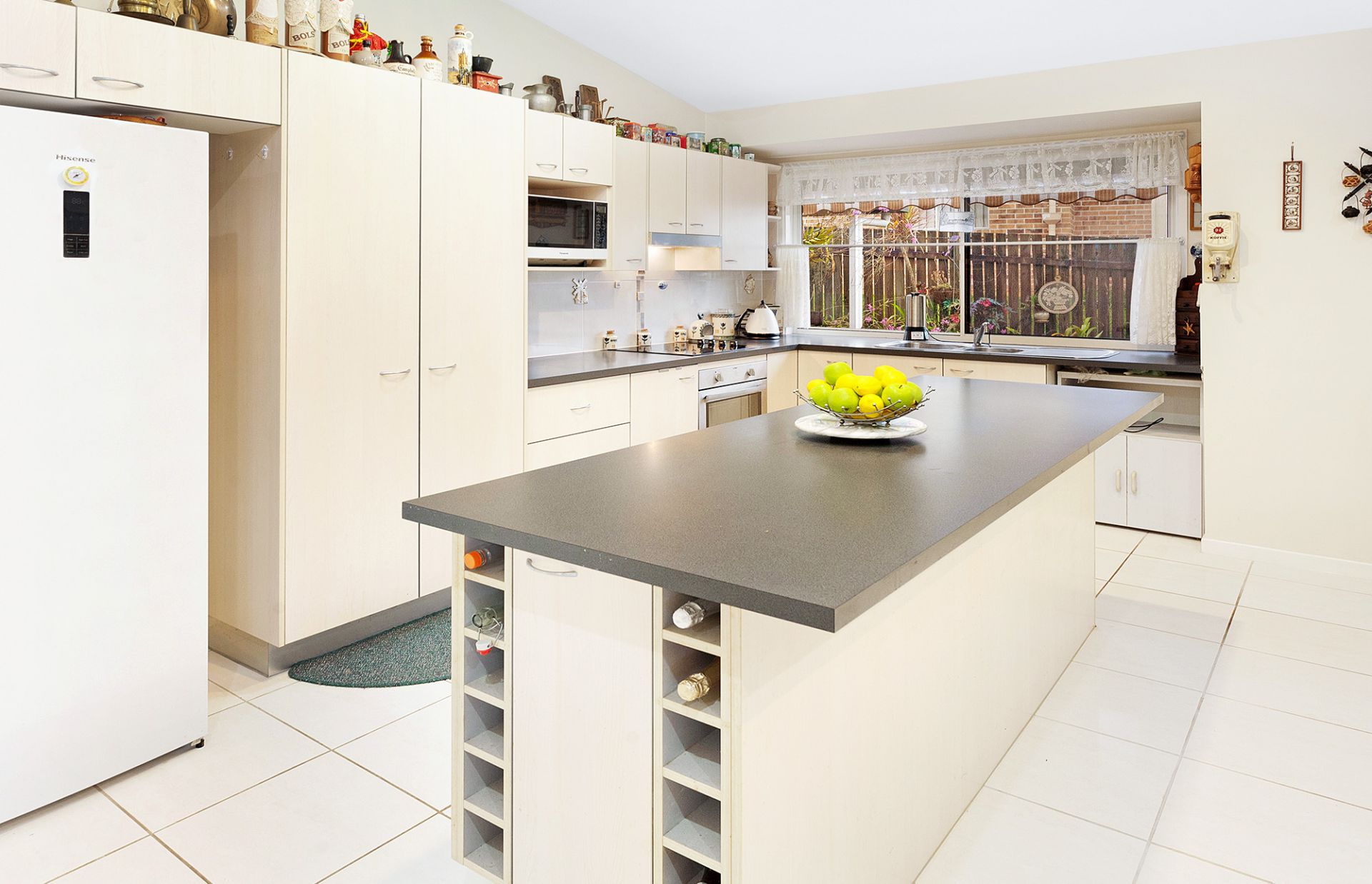 Kitchen features a lovely Northerly aspect and includes an island bench, room for a dishwasher and plenty of drawers and cupboard space
