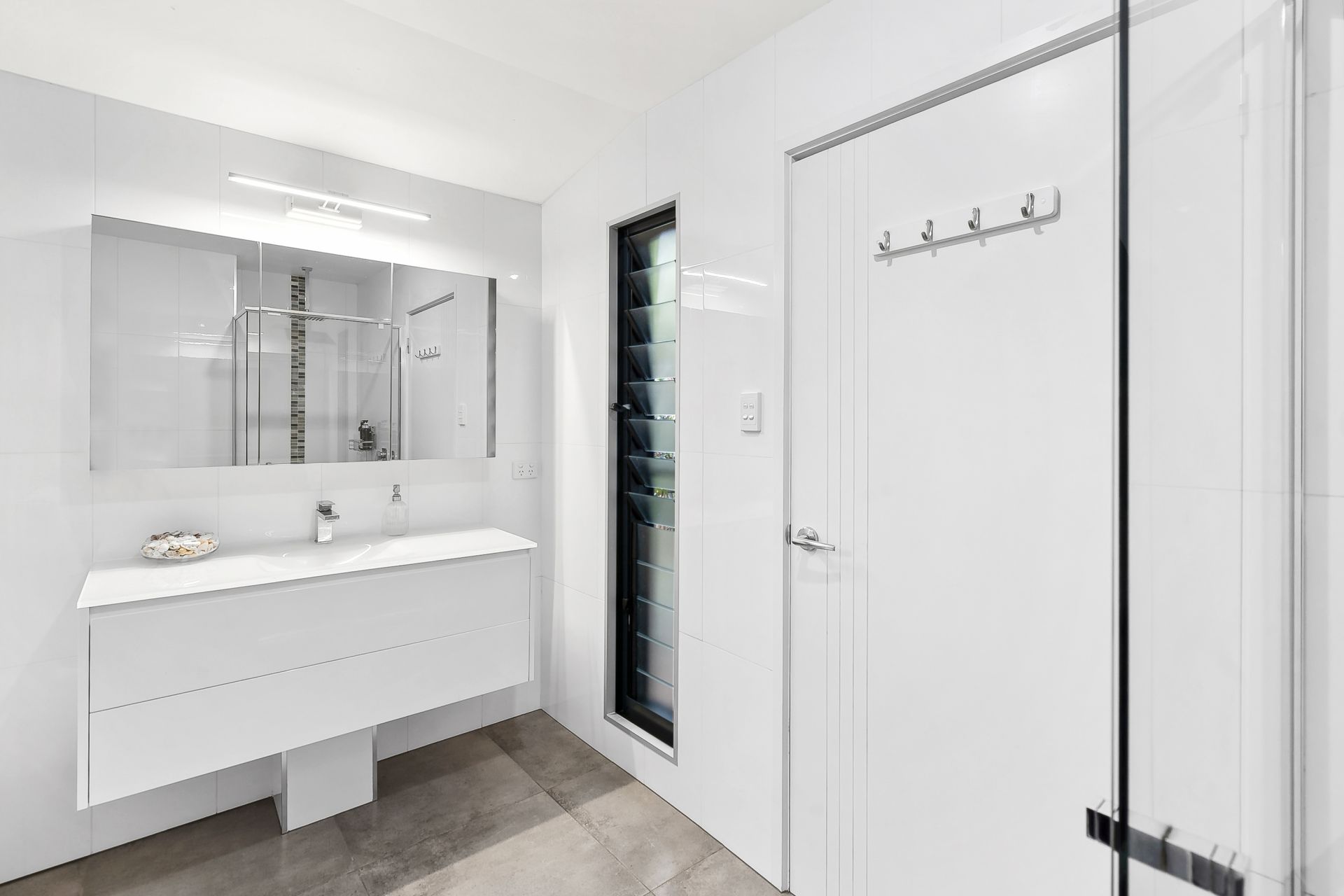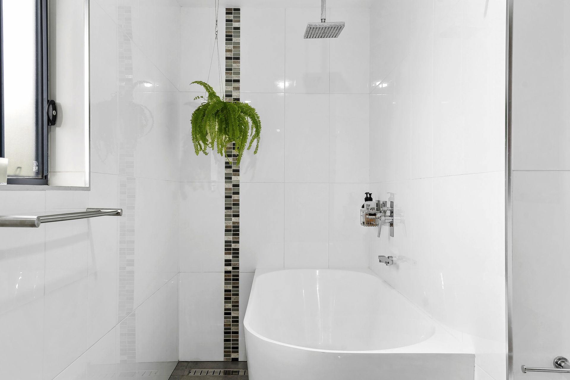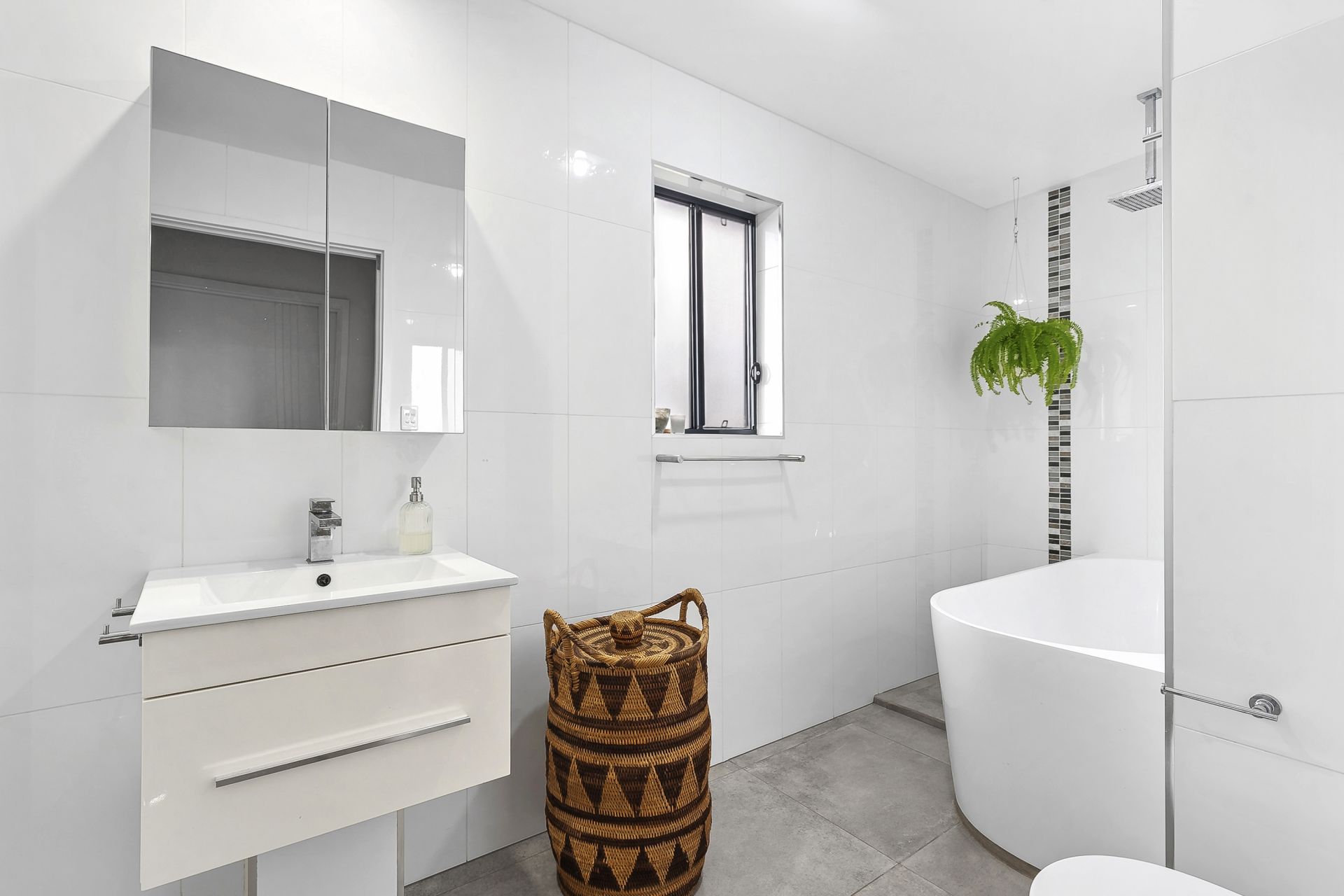 - Guest bathroom with wall to ceiling tiles, luxurious bath, stylish rain head shower and wall hung vanity