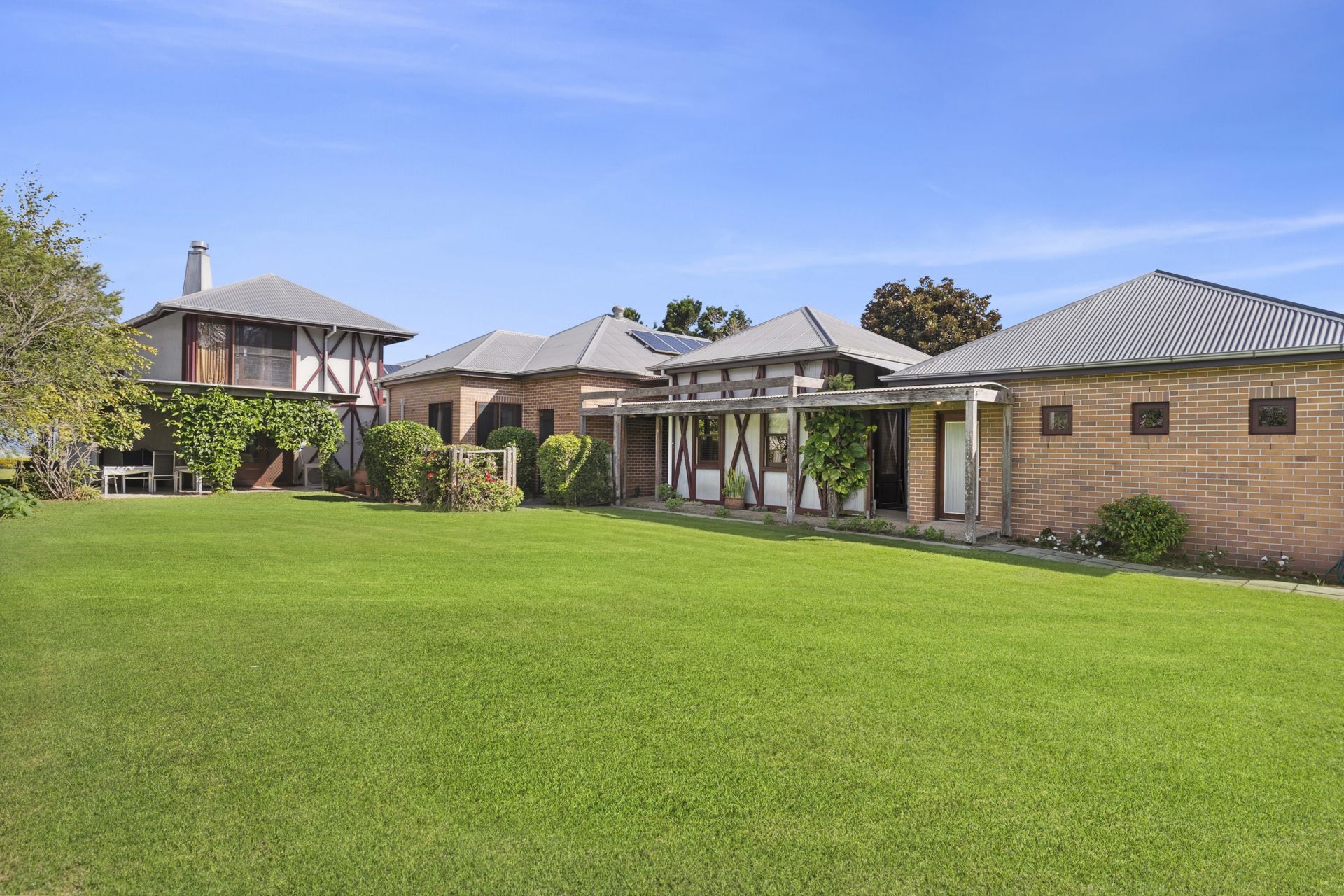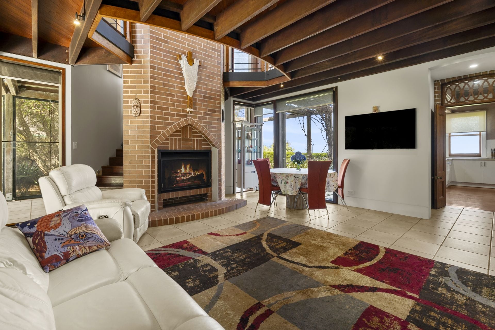 - Everyday living and dining flows from the kitchen and enjoys reverse cycle air conditioning plus views through floor to ceiling glass. This light filled room also showcases a second fireplace with a unique, gothic style brick arch. This relaxing area opens to the North facing, outdoor, covered entertainment area overlooking the back gardens, a relaxing spot for that lazy Sunday brunch