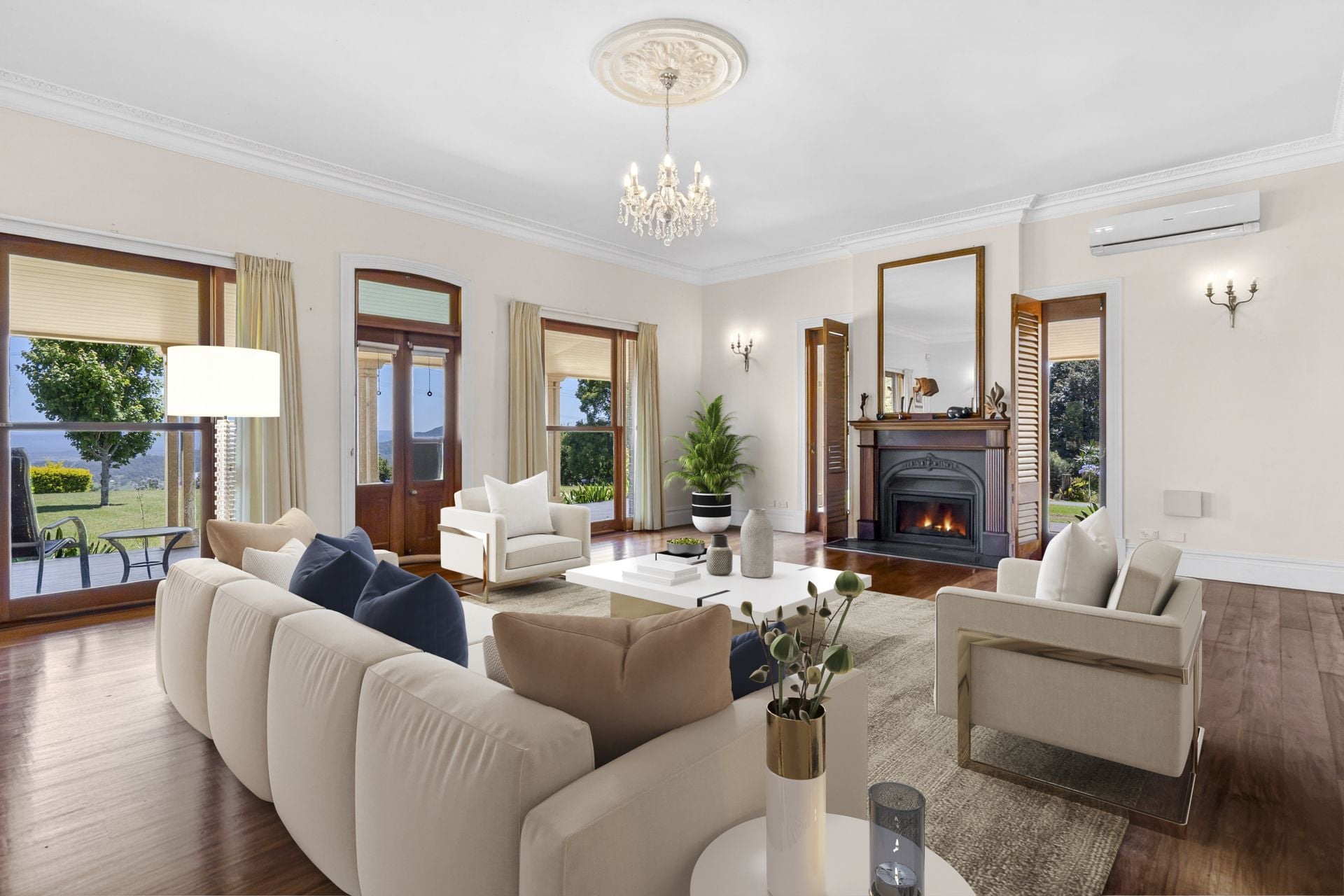 - Multiple living zones including a formal lounge with floor-to-ceiling glass, irreplaceable mountain views and a traditional fireplace with cast iron mantle