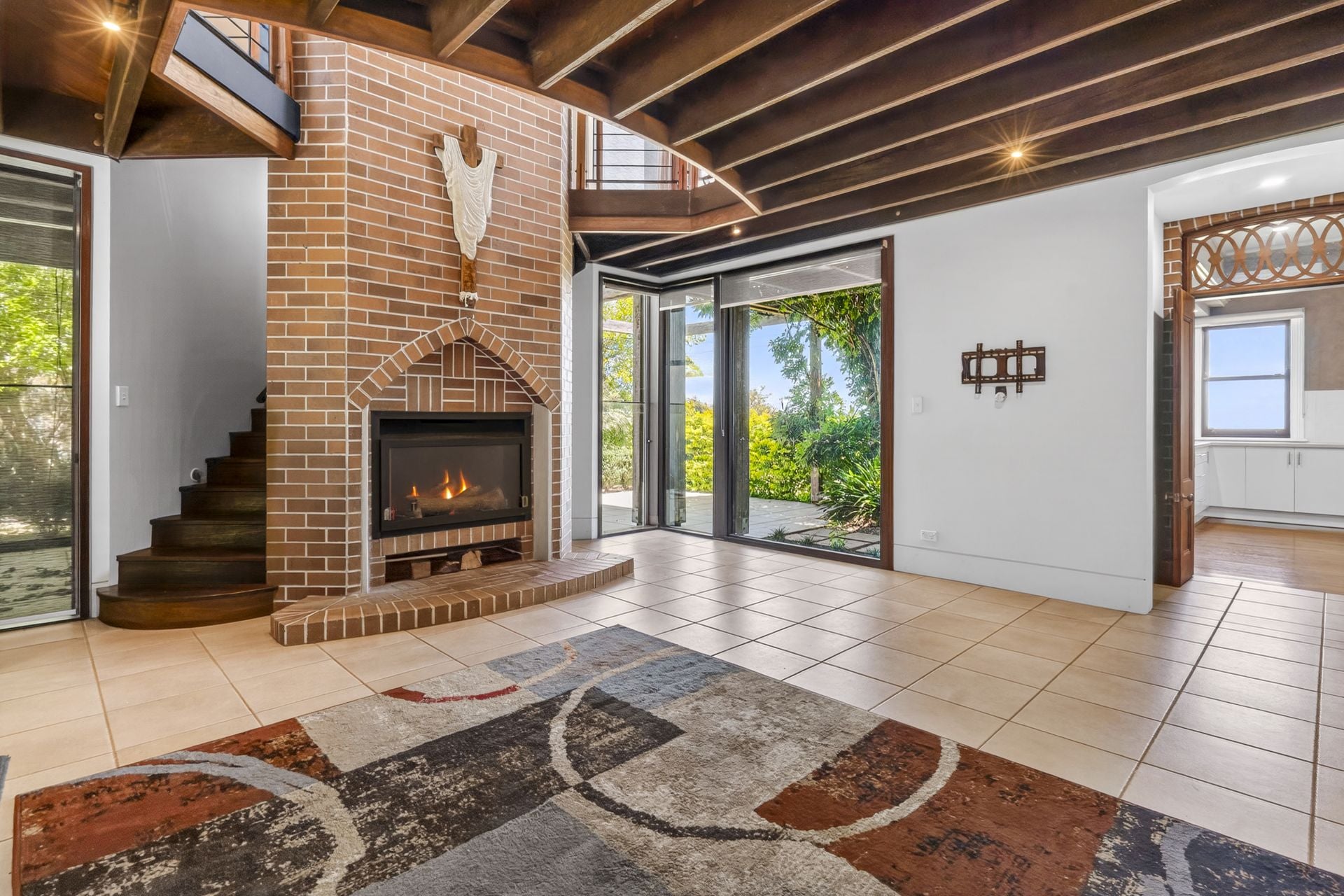 - Open-plan living and dining area with a second fireplace framed by a distinctive gothic brick arch, flowing to a north-facing covered alfresco area